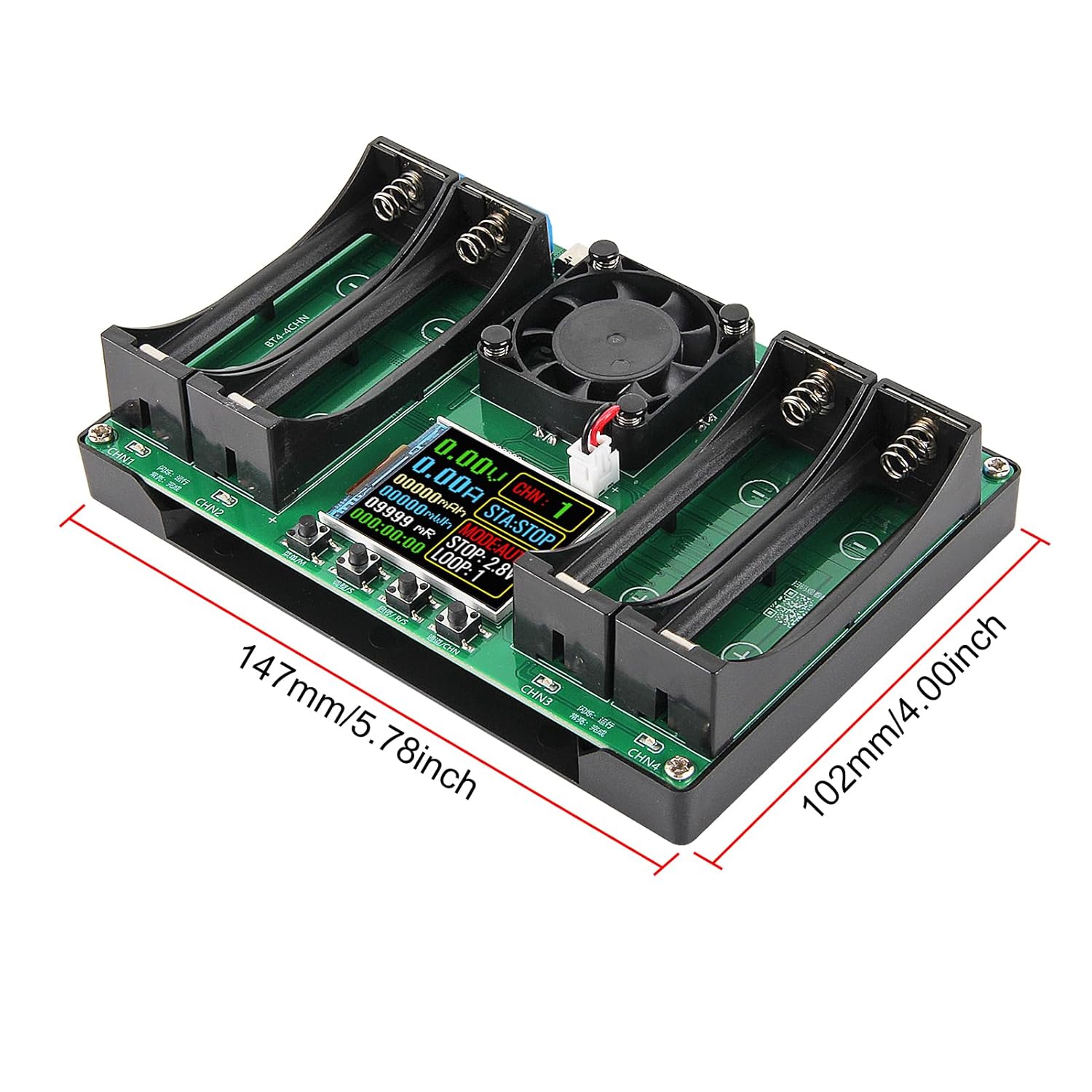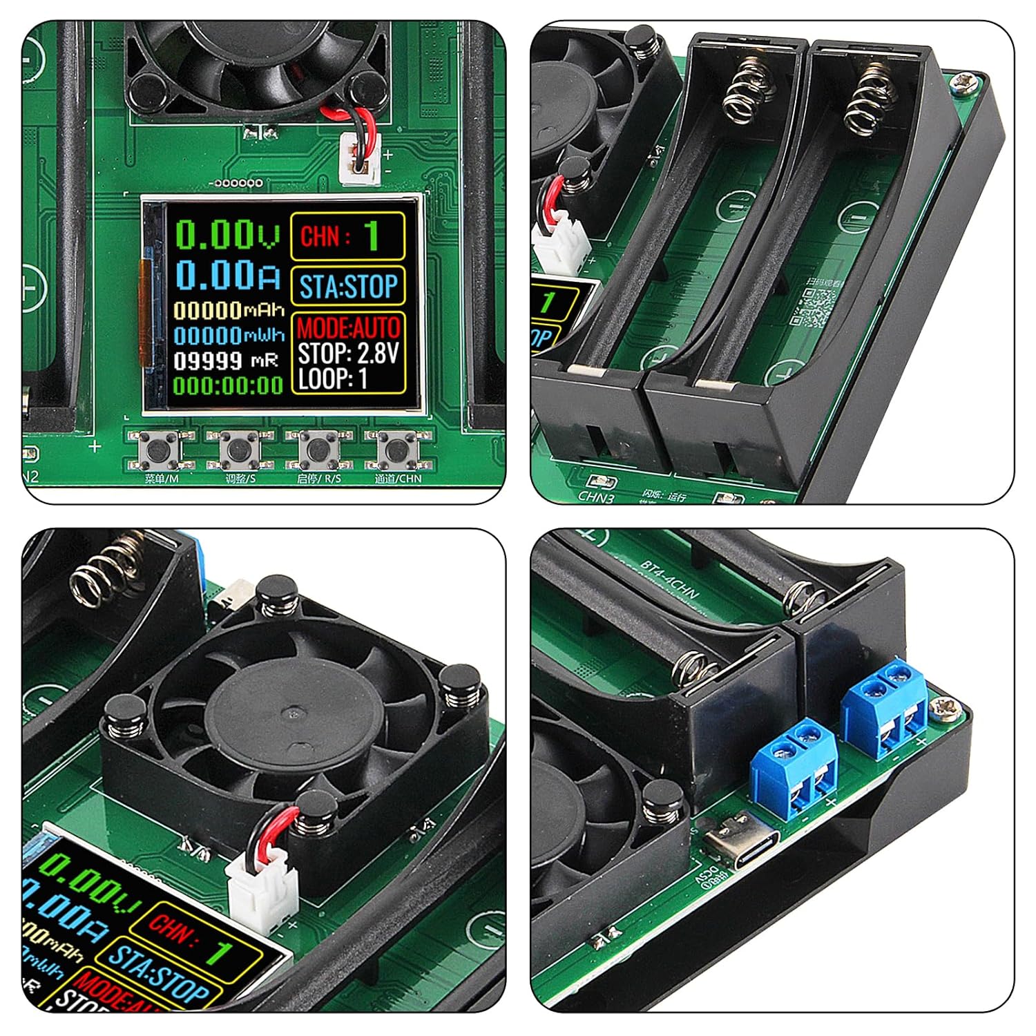 4 Independent Test Channels: Perform simultaneous charging, discharging, and capacity tests on up to 4 batteries independently without interference. Automatic Operation: Supports fully automatic charging and discharging cycles (1-9 cycles adjustable in auto mode). Charging automatically stops when the battery is full. Internal Resistance Measurement: Utilizes the DC two-wire method to provide reference internal resistance values. For the most accurate reading, measure when the battery is fully charged. Comprehensive Safety Protections: Features overheating protection and automatic power-off saving for your settings. Flexible Discharge Voltage: Choose from 11 stop-discharge voltage levels (2.5V to 3.5V). Dual Type-C Power Input: Includes two Type-C interfaces for flexible power supply options (adapter and cable included).Ideal for Multiple ApplicationsWhether you're sorting used 18650 cells for a DIY power bank, testing AA/AAA batteries for household devices, or maintaining your RC car battery collection, this tester provides the critical data you need. Imagine quickly identifying weak cells in a batch, ensuring only the best performers go into your projects.Important Usage Notes: After installing a battery, wait a few seconds for the voltage and internal resistance readings to stabilize. Discharge current is fixed at a maximum of ~1A (non-adjustable, non-constant current). Charging voltage is fixed at 4.2V. Not compatible with LiFePO4 batteries. Internal resistance readings may appear high at low voltages; reinstall the battery for a more accurate measurement. Package Includes: 2 x 18650 lithium battery capacity tester