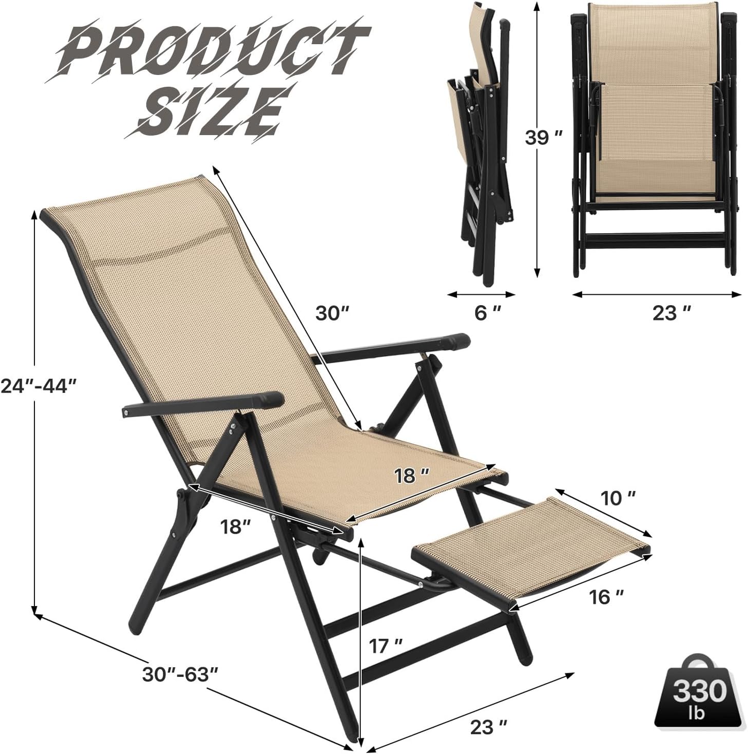 Product Description: Patio Outdoor Folding Adjustable Lounge Chairs Set of 2. These patio lounge chairs are designed to enhance the quality of your outdoor life. Give more comfort to you when chatting, reading, resting or bathing the sunshine. It is suitable for patio, garden, lawn, backyard, balcony, poolside and etc Features: 1) Easy folding & storage design make it easy to move 2) Back adjustment control lets you change the positions to your need 3) Safe Lock System can lock the position firmly.Anti-slip Foot enhance the stability 4) Breathable Fabric adds cool and comfort Specifications: Dimension: 72" L x 25.98" W x 15.94" H Folded Dimension: 29.53" L x 25.98" W Weight Capacity: 270lbs Frame: Lightweight Powder-coated steel frame Fabric: Breathable Fabric Portable & Fold-able, no assembly required Color: Beige, Grey Package Includes:. 2 x Patio Chaise Lounge. 1 x Instruction. Notice: There may be some color differences between objects and pictures online in terms of the lighting during photos shooting and the setting of the monitor's display.