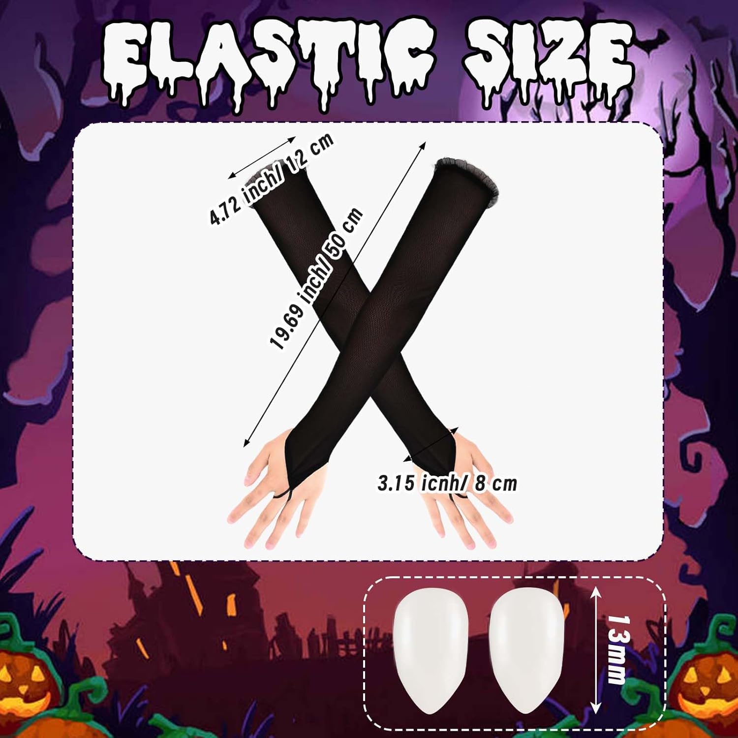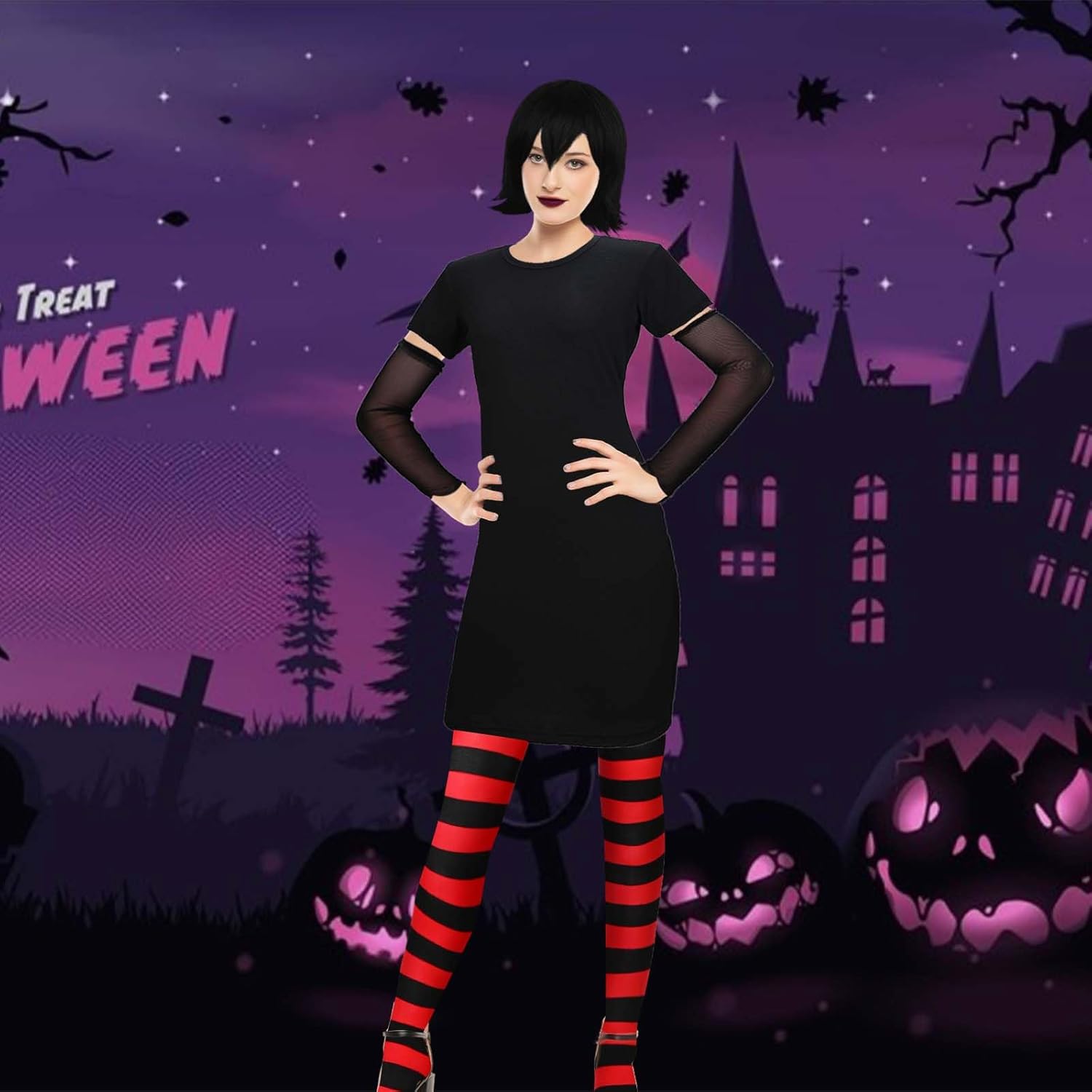 【Halloween Costume Accessories】you will receive a black short dress,a piece of vampire wig,a pair of ring style over elbow fingerless gloves,a pair of black and red strip pantyhose and a pair of vampire dentures,ideal combination for you to wear,great supplement for your Halloween costume .Wearing them on various party and it will make you eye catching in the crowd,you can also share them with your friends.