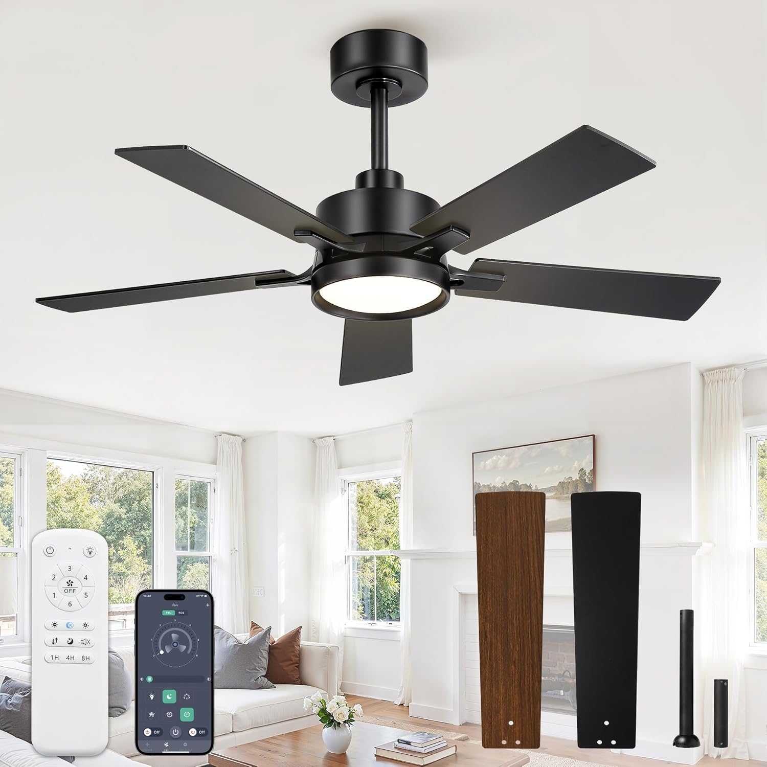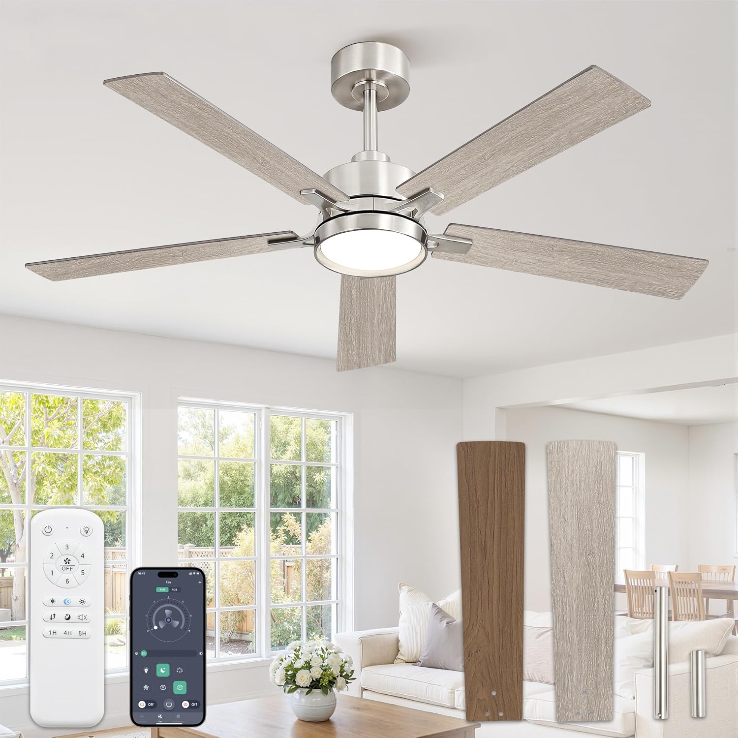 | Included Components | 18W LED Kit, 2 Downrods (5"/8"), 5 Blades, 52-inch Fan Motor, Remote |