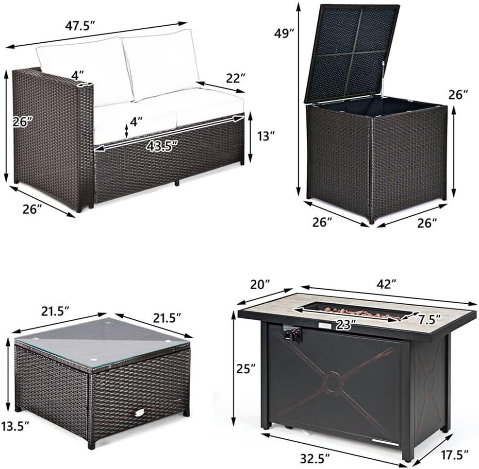 Features:60,000 BTU for efficient and steady heating,Easy to operate with a simple ignition systemCeramic tabletop for beautiful addition and fade resistanceReduce heat diffusion with included lave rocks,Keep the fire table balanced with adjustable foot padsServe as a fire table or a coffee table with a removable lidSoft padded cushions for comfy sitting experience,Cushion covers are removable for easy cleaningTo prolong the service time, please always keep cushions dryBring more storage space thanks to its storage boxSelected mix brown PE wicker for sun protection,Ensure strong stability with sturdy and anti-rust steel frameTips about the Fire Pit Table:1) Please do not completely cover the stainless steel burner with lava stones.2) Please keep lava stones dry to prevent splashes caused by humidity when using.3) Match the standard 20 lbs propane tank (not included).4) Please wait for the stainless steel burner to cool down and cover it with a waterproof cover.Specifications:Color of PE Rattan: Mix BrownColor of Cushions: BeigeMaterial: PE Rattan, Steel, Polyester, Sponge, Tempered Glass, CeramicHeat Output: 60,000 BTUSize: As ShownPackage Includes:1 x Fire Pit Table1 x Fire Pit PVC Cover1 x Coffee Table1 x Storage Box2 x Loveseats4 x Back Cushions4 x Seat Cushions2 x Instructions(no other presentation items included).Notice:1. Due to manual measurement, please allow 2-3% error, before you bid, please make sure you don't mind.2. The color may vary due to different displays, please refer to the actual product.