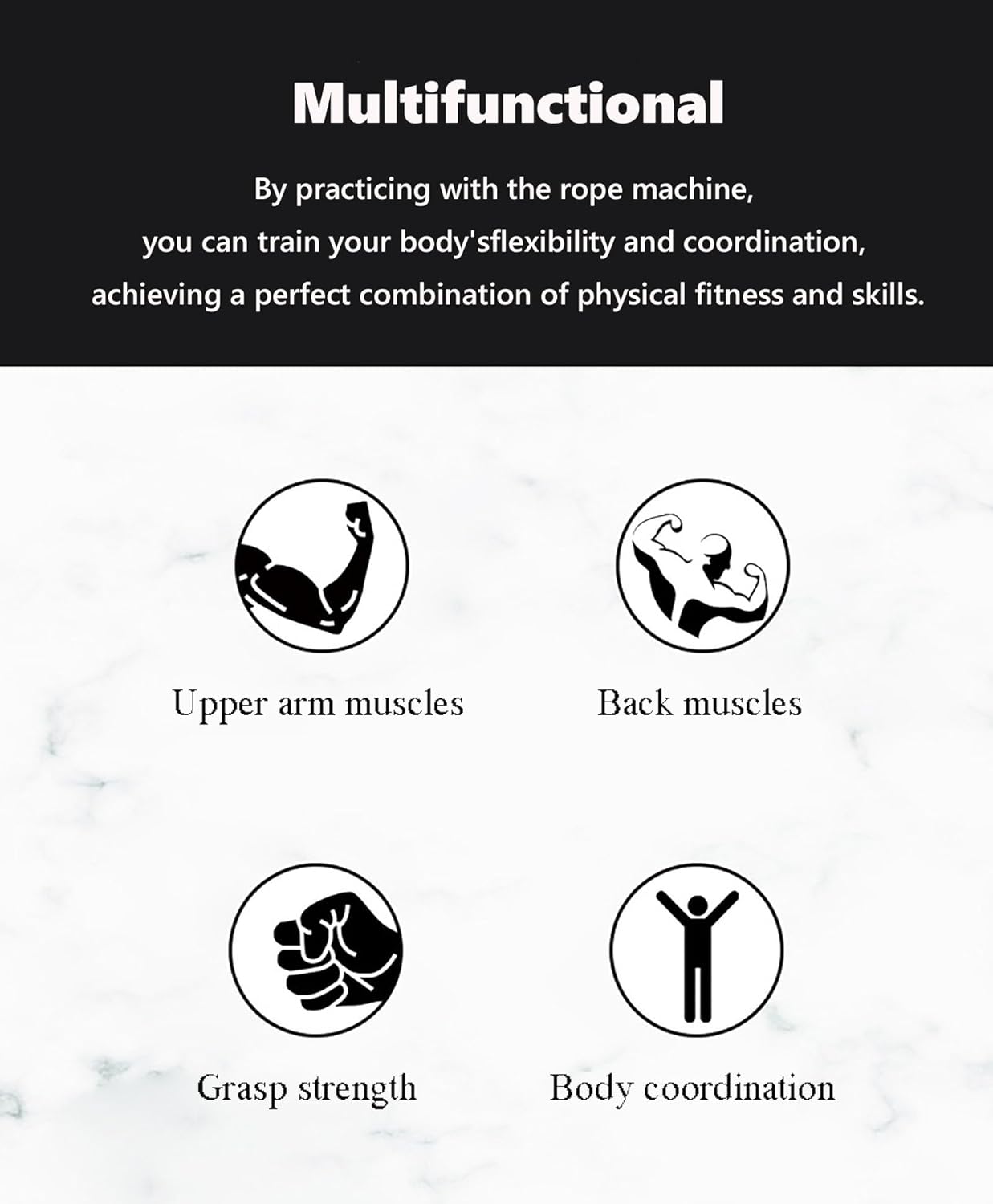 Experience a new level of fitness with our Endless Rope Trainer, designed to cater to various workout styles and fitness levels. Featuring a knob-controlled tension system with a maximum resistance of 30kg, this trainer allows you to customize your weight training sessions, enhancing strength, endurance, and coordination. Whether you're a beginner or an advanced athlete, you'll find the versatility you need to reach your fitness goals. Constructed with a high-density nylon rope and a durable steel core, our Endless Rope Trainer has been tested over 100,000 times, ensuring exceptional stability during high-intensity workouts. The non-slip handles provide a secure grip, allowing you to focus solely on your training without distractions. Its compact design and quick-install hook make it easy to mount on doors or walls, making this trainer perfect for home workouts, gym sessions, or outdoor fitness routines. No assembly is required, so you can start your journey towards improved functional fitness, boxing, or aerobics in no time. Specifications: - Name: Endless Rope Trainer - Material: Reinforced Nylon, Stainless Steel Pulley - Color: Black - Max User Weight: 150kg/330lbs - Maximum Resistance: 30kg/66lbs - Product Size: 28*41*198cm/11*16.14*78in - Net Weight: 7.6kg/16.8lbs What’s included: 1 x Endless Rope Trainer Please note: Minor color variations may occur due to lighting and individual perception. Measurement errors may range from 1-2cm, which are not considered quality defects. Regularly inspect the rope and pulley for safety to ensure the best workout experience. Elevate your fitness routine with the Endless Rope Trainer and discover the benefits of tailored resistance training today!