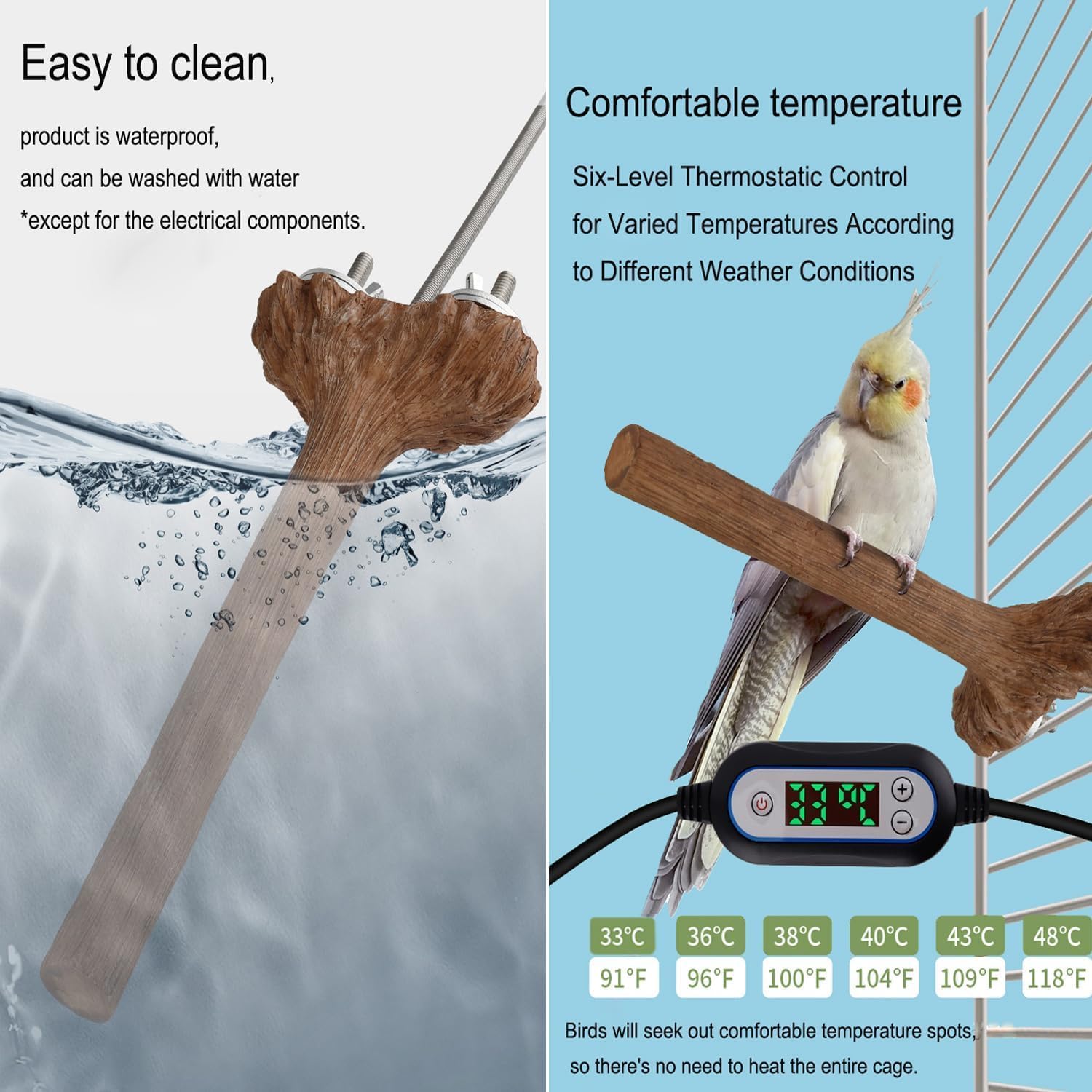 Product Description: Introducing the Thermostatic Heated Bird Perch, a versatile and efficient solution to keep your feathered companions warm and content throughout the winter season. This heated perch offers a range of features designed for your convenience and your birds' well-being.Customizable heat settings put you in control of your bird's comfort. You can adjust the warmth to suit your bird's preferences, ensuring they have the perfect cozy spot in their cage. With precise thermostatic control, you can trust that this perch will maintain a consistent, bird-friendly temperature, ensuring your feathered friends are comfortable even on the coldest days. Whether you have parrots, parakeets, or other bird species, this heated perch is versatile enough to accommodate them all. Safety is paramount, and our secure mounting hardware ensures the perch stays in place, preventing any mishaps. Plus, the Arigoul perch operates quietly, creating a peaceful ambiance for your birds to relax and perch comfortably. Elevate your birds' winter experience with the Arigoul Thermostatic Heated Bird Perch. It's the perfect addition to their cage, offering warmth, customization, and peace of mind. Give your birds the gift of comfort with Arigoul . Product parameters Power: 12V 5W length: 7.9in/20cm wide:3.7in/9.5cm high:1.4in/3.5cm line length:39.4in/100cm