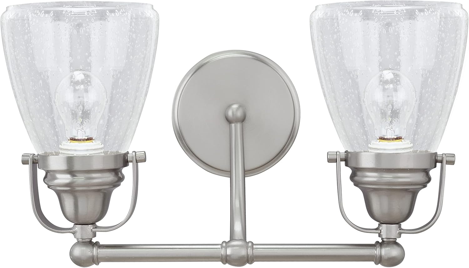 Aspen Creative is dedicated to offering a wide assortment of attractive and well-priced portable lamps, kitchen pendants, vanity wall fixtures, outdoor lighting fixtures, lamp shades, and lamp accessories. We have in-house designers that follow current trends and develop cool new products to meet those trends. Aspen Creative offers a transitional designed 2 light bathroom vanity wall light fixture in brushed nickel. It includes a clear seedy glass shade. Fixture Dimensions: 7 1/4 inch Deep x 15 3/4 inch Wide x 9 inch Height. Uses 2 60 watt medium light bulb (not included). Fixture is dimmable with standard wall dimmer. UL listed for bathroom wall installation above the mirror and vanity cabinet as well as powder rooms and make up rooms. It also can be installed as a wall sconce in living room, family rooms and hallways.