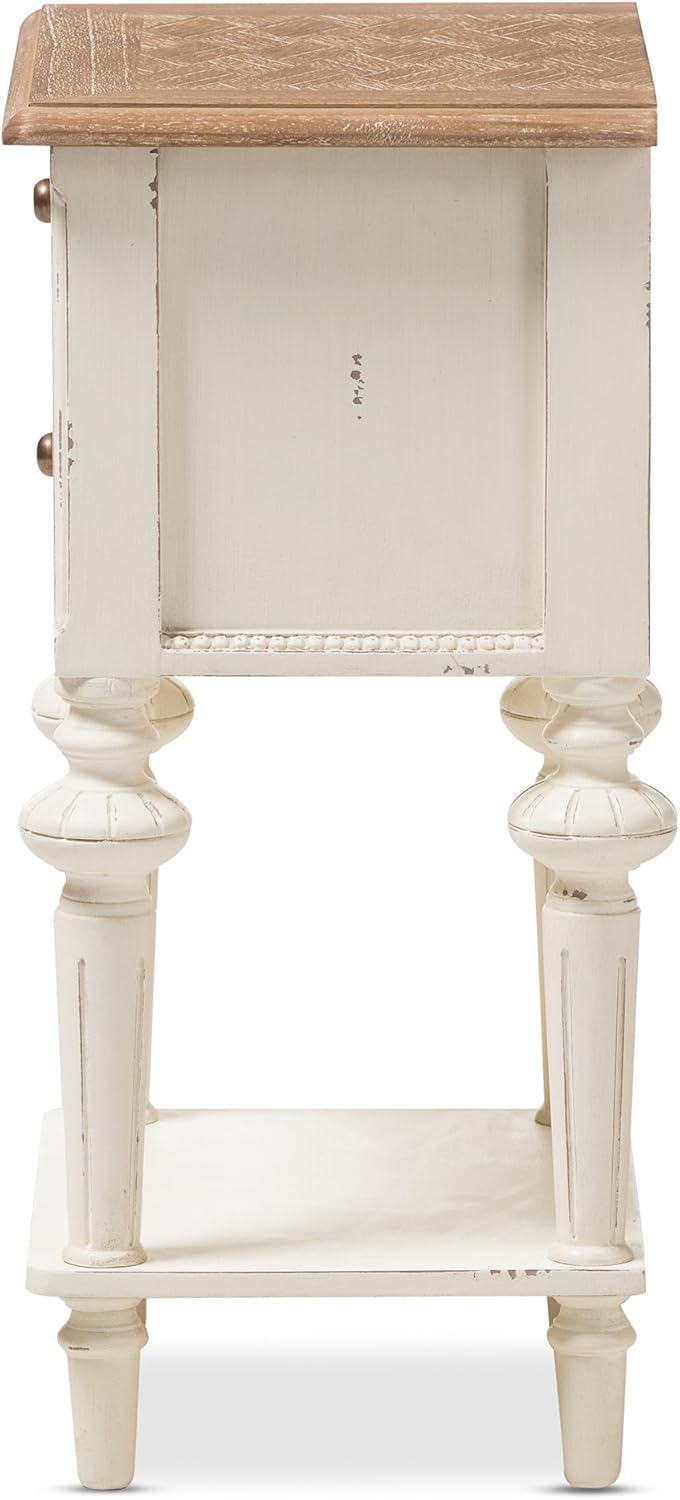 Traditional and contemporary elements work together in the Marqueterie French provincial style nightstand, giving it a timeless elegance. The gorgeous provincial design elements have been delicately restored and finished with a rustic iron handle, weathered oak wood top and distressed white polish. This bedside table with two drawers and one shelf works beautifully as a side table in the living, entry, hallway, in addition to the bedroom. The neat proportions of this bedside table make it a functional piece for smaller spaces. The meticulously carved French fluted legs and corners and the frame details are paired beautifully with a classics white distressed finish, giving a traditional style table a chic twist. Classical and functional, the Marqueterie nightstand is made in Indonesia. It requires assembly.