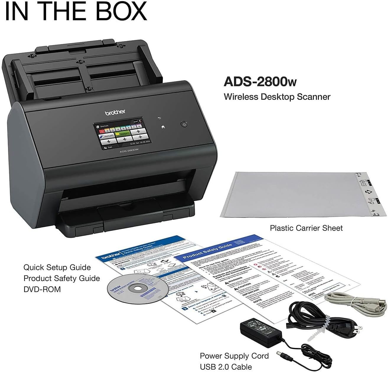 "The Brother ImageCenter ADS-2800W Desktop Scanner is a dependable office scanner with lightning-quick scanning capability that doesn’t compromise on quality. A perfect office solution for mid-sized to large businesses, the ADS-2800w simplifies the way your documents are captured, processed, managed and delivered. This scanner offers both wireless and wired gigabit Ethernet connectivity, Wi-Fi direct, and high-speed USB 2.0 for local connections. The Web Connect feature allows you to scan to a wide variety of destinations, including cloud-based applications like Google Drive Evernote, Dropbox, and Microsoft OneNote and OneDrive. This office scanner delivers incredibly fast scanning. Scan single and double-sided materials in a single pass, in both black-and-white and color, at speeds of up to 40 pages per minute. Precision scanning is not compromised, with resolutions of up to 600 × 600 dpi and 1200 × 1200 dpi interpolated. You can also select multiple-page scanning modes, including 2-in-1 mode for capturing 11″ × 17″ documents or continuous scan mode for scanning unlimited pages into a single file. Use the 50-sheet capacity auto document feeder for multiple-page scanning projects. Easily scan photos, documents, receipts, embossed plastic cards, business cards, and more. Scans documents of up to 8.5″ wide × 196″ long (in continual scan mode). The integrated image optimization also includes hole punch, background, and blank page removal. The ImageCenter ADS-2800w is bundled with a valuable software suite that includes PDF editing, OCR, and desktop document management programs. It also provides a wide range of security features, including Secure Function Lock, SSL/TLS, Enterprise Security (802.1x), network user authentication, and corporate email address lookup via Active Directory (including LDAP). This product is Kofax VRS certified as an industry leader in image-processing software that automatically examines scanned materials and applies the appropriate correction settings for optimal results. It is compatible with Windows, Mac, and Linux and comes with a one-year limited warranty and lifetime phone technical support."
