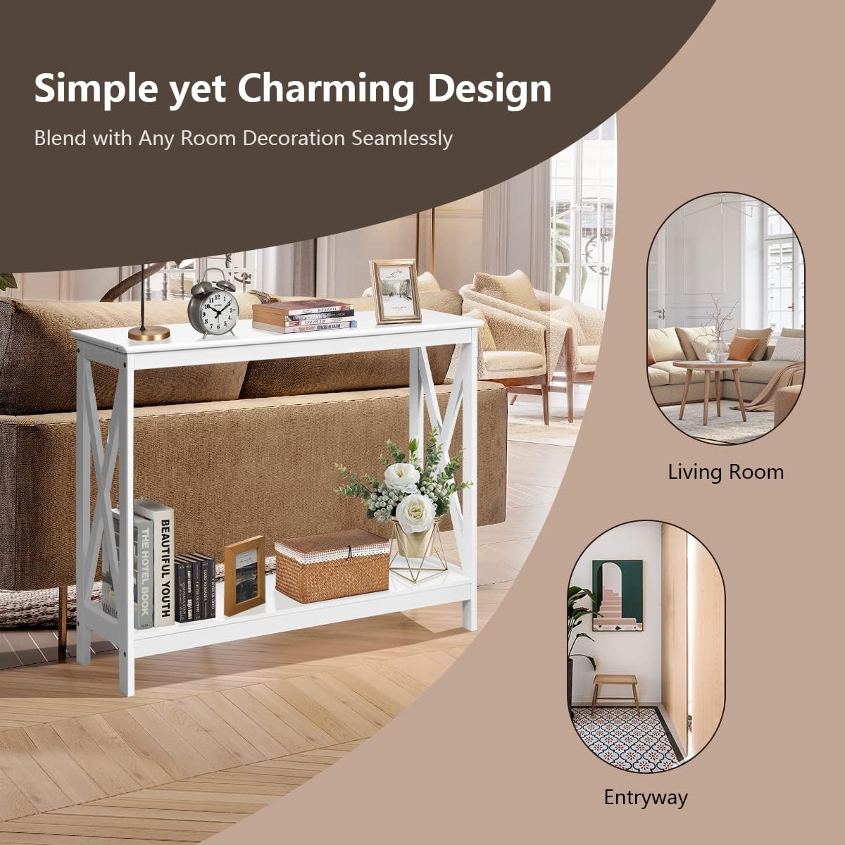 Product DescriptionThis is our elegant console table which will add glamour to your space!Crafted from high quality P2 MDF, this table is sturdy and durable with a long service life. The X-shaped structures on both sides ensure overall stability without easy shaking. In addition to the spacious tabletop, it’s also worth mentioning that the open shelf provides additional storage space for books, toys, crafts, etc. The smooth surface is easy to clean, so that you can wipe it effortlessly with a soft, damp cloth when there is dust on it. As a perfect combination of aesthetics and practicality, this console table can’t be missed!Features:Constructed of high-quality P2 MDF to last for years of useDesigned with open shelf to provide additional storage spaceX-shaped structure for added stability without easy shakingIdeal for living room, bedroom, entryway, hallway and various placesIncludes specific instruction and all accessories for easy assemblyEasy to clean with waterproof and smooth surfaceIncludes specific instruction and all accessories for easy assemblySpecifications:Color: WhiteMaterial: P2 MDFOverall Dimension: 39.5’’x 12’’ x 31.5’’(L x W x H)Net Weight: 22 lbsWeight Capacity of Tabletop: 66 lbsWeight Capacity of Shelf: 33 lbsPackage includes:1 x 2-tier Console Table1 x Instruction