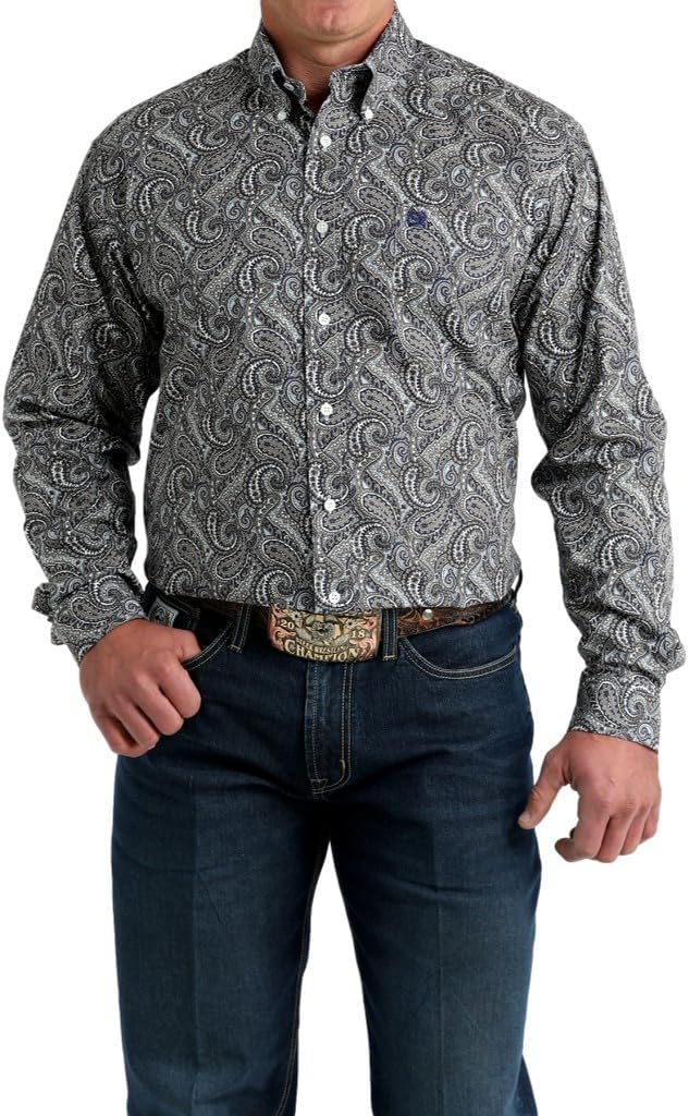 Mens Cinch Shirt: Mens Cinch Western Wear. This men’s western shirt from Cinch was made for cowboys like you. This shirt has a cool tone multi-color paisley print. This long sleeve shirt has a button front closure with white buttons. This shirt is made with printed plain weave cotton. MTW1106001