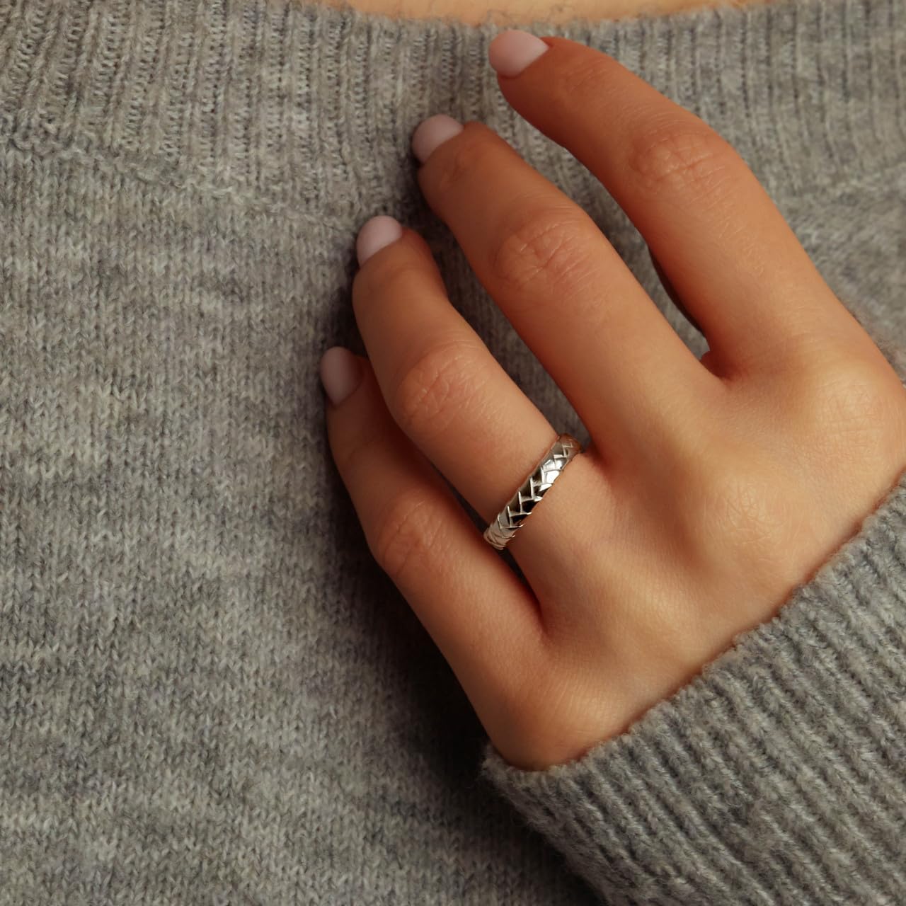 This refined silver band features a sculpted textured design that adds depth and character while maintaining a sleek, polished finish. The repeating pattern creates subtle dimension and visual interest, catching the light beautifully from every angle. Smooth on the inside for comfortable wear, this band balances bold detail with everyday elegance. Versatile and timeless, this silver band can be worn alone as a statement piece or paired with other rings for a layered look. Ideal as a wedding band, anniversary ring, or everyday essential, it offers classic style with a modern edge suited for any jewelry collection.