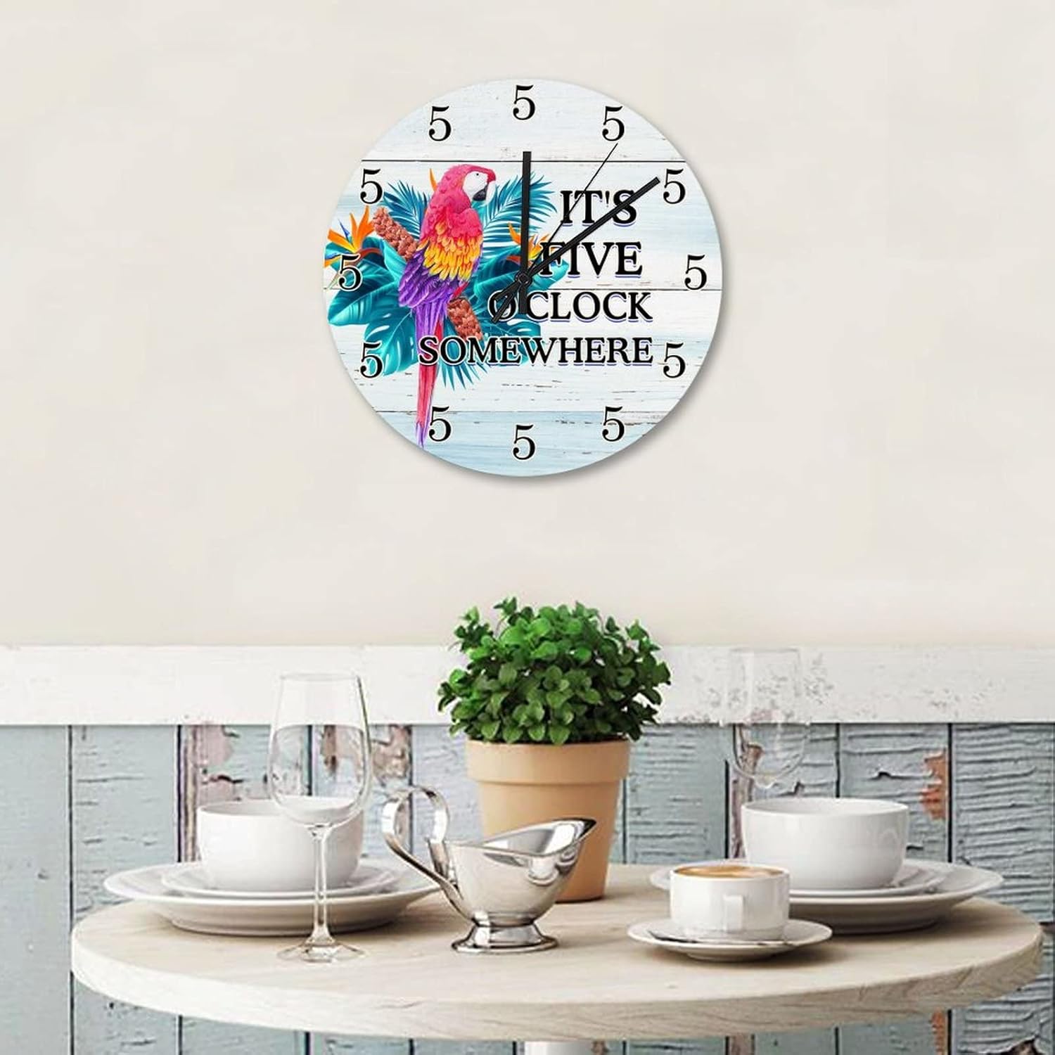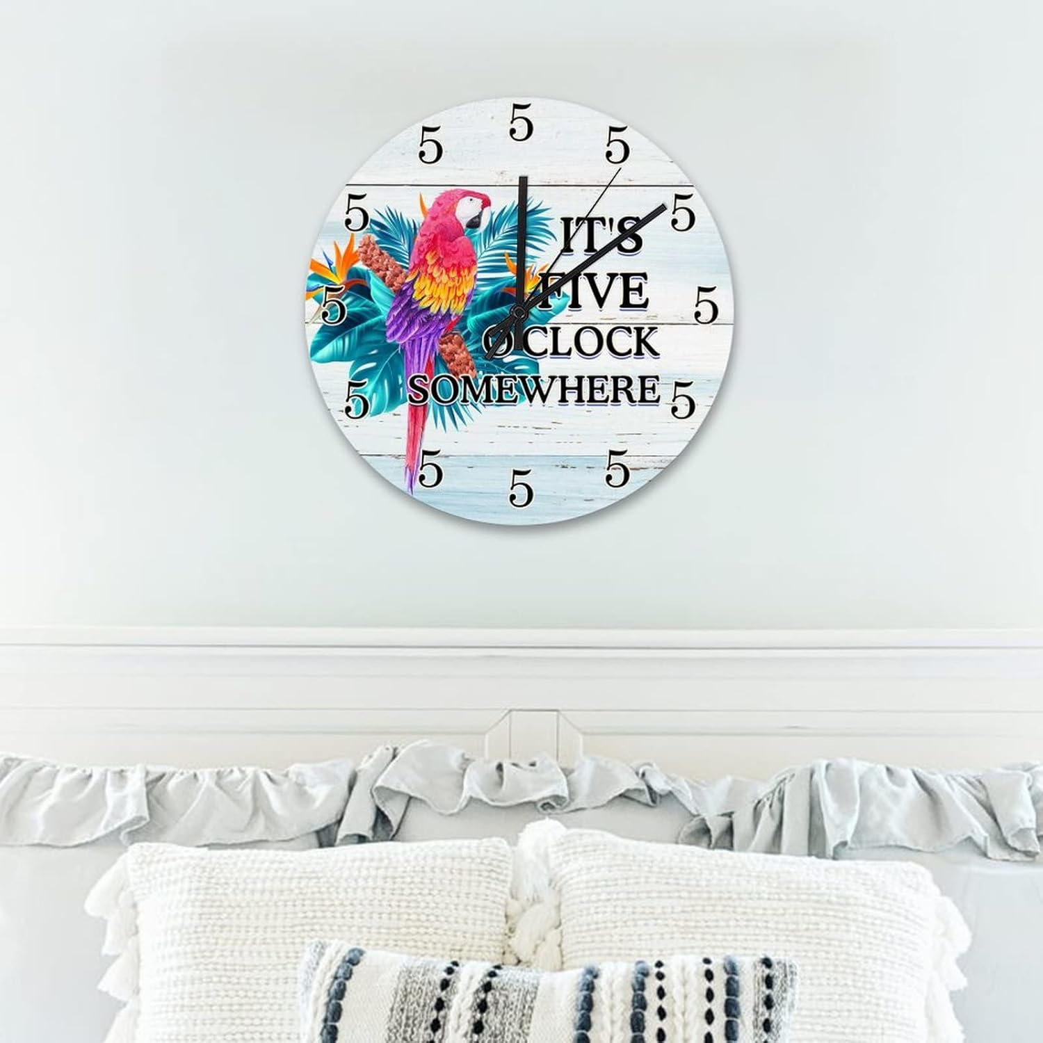 It's 5 O'Clock Somewhere Parrot Wood Clock Summer Tropical Sea Beach Room Decorative Wall Clock Silent & Non-Ticking Arabic Numbers Round Clock Living Room Bedroom Office Kitchen School 15x15 in??Details:Product Size: 10/12/15 inches, (25/30/38 cm)Shape:RoundMaterial: Wood??Functional Home DécorThis Summer Tropical Sea Beach clock aren't just for timekeeping. They function as beautiful wall decor pieces, beyond telling time, and bring both style and purpose to any room.A charming home decoration, very suitable as a housewarming gift, making the home more warm. Suitable for any room, you can put it in any room such as home, living room, master bedroom, kitchen, bathroom, home office, etc. Elegant, durable and stylish.??Clock Hands Troubleshooting Guide:Check that the battery is a new battery and not a used battery.Make sure the hour and minute hands are not crossing or touching each other. If they are, adjust the hands by slightly bending them.See if the center pin that holds the hands together is firmly pushed in or screwed on, depending on the style.If hands are still not moving after the above, please reference the hands replacement instructions included with all of our open face clocks.