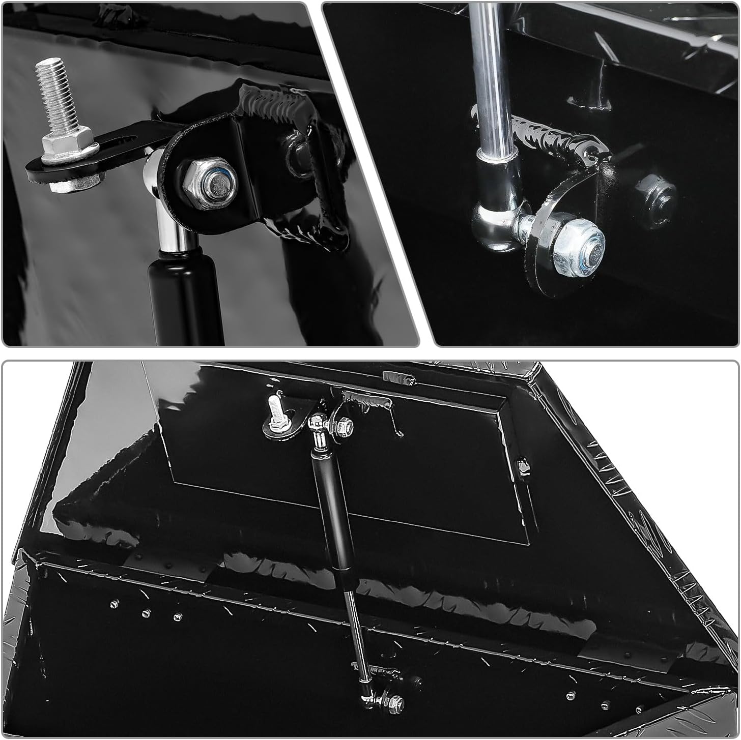 Our tool box is designed to save space and provide extra storage in your truck bed. This tool box is constructed of heavy duty textured aluminum for maximum durability. The door features a over-hanging lip which resists water from getting inside. Fold up door provides full access. Built-in lock ensures all items are kept safe and secure. This aluminum truck bed tool box is perfect for storing your tools in your vehicle or at home.