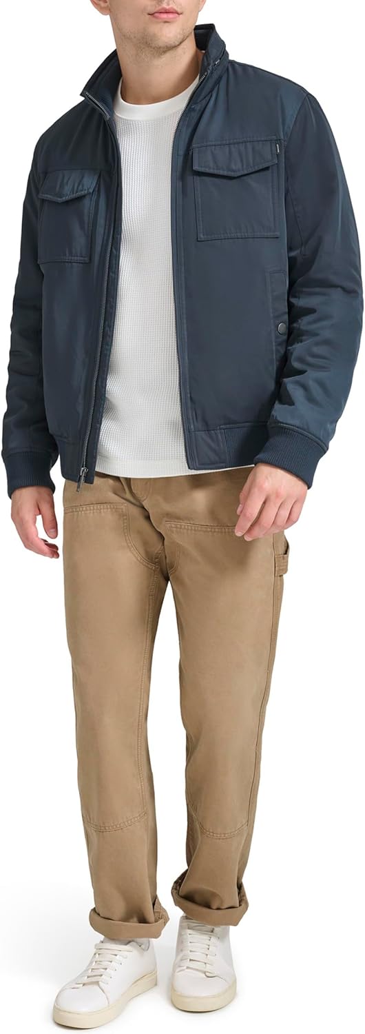 Introducing our Men's Bomber Jacket, a versatile outerwear essential designed to keep you warm, stylish, and prepared for any adventure. Crafted with meticulous attention to detail, this jacket features down alternative insulation that locks in warmth while maintaining a sleek silhouette. The quilted lining pattern not only enhances comfort but also effectively traps heat within each stitch, ensuring unparalleled insulation against the chill. Emphasizing practicality, our jacket boasts a water-resistant shell fabric, providing protection against inclement weather without compromising style. The front zipper extends the length of the garment, accompanied by an array of strategically placed pockets for convenience. With two chest flap pockets, two lower hand pockets with snap closures, and an interior safety zipper pocket, you'll have ample storage for essentials. The inclusion of side entry and chest pockets further enhances accessibility, ensuring your belongings are always within reach. Adding a touch of sophistication, the stand collar includes a zip-out hood, offering versatility that seamlessly transitions from style to functionality. Finished with rib knit detailing inside the collar, complemented by rib knit cuffs and hem, our bomber jacket effortlessly blends sporty aesthetics with polished refinement, making it a must-have addition to your wardrobe.