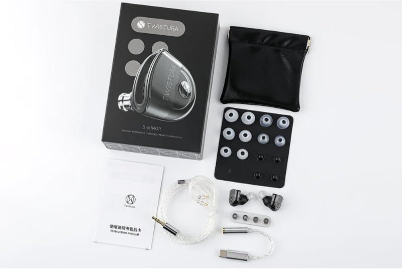 SPECIFICATIONS Brand: TWISTURA Model: D-MINOR Type: Replaceable Cable HiFi IEM Driver Unit: 10mm Dual-Magnetic Dynamic Driver Diaphragm Material: LCP Dome Composite Diaphragm Impedance: 30Ω ± 3 (@1kHz) Sensitivity: 108dB/Vrms (@1kHz) Frequency Response: 15Hz-37kHz Connector: 0.78mm 2-Pin Cable Plug: 3.5mm Stereo Single-Ended Plug WHAT IN BOX? D-Minor * 1 Earphone cable * 1 Eartips * 6 pairs Nozzles * 2 pairs Adapter * 1 Storage case * 1 User manual * 1