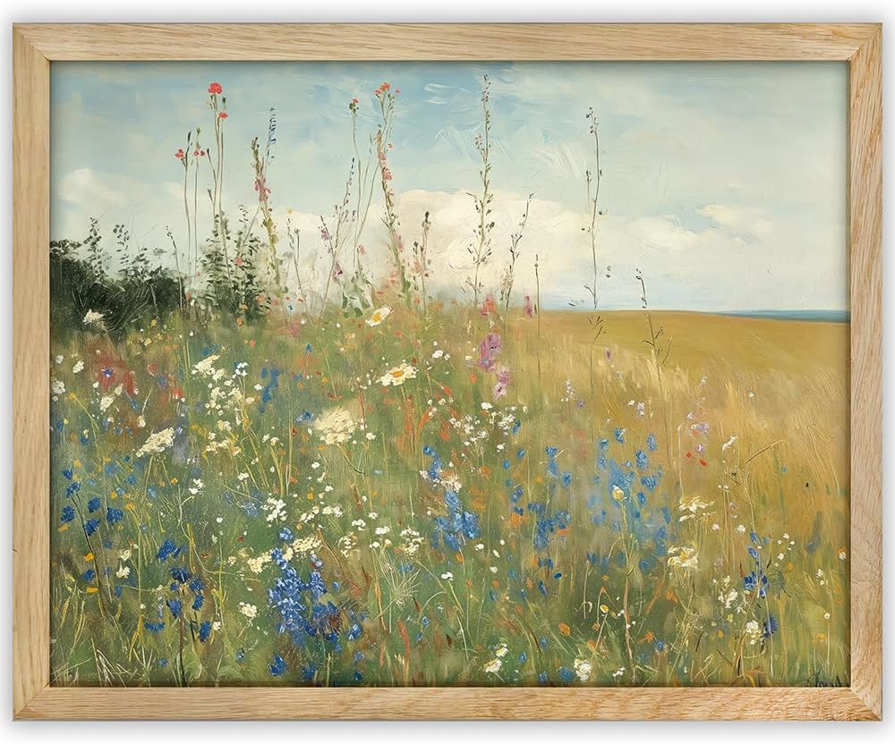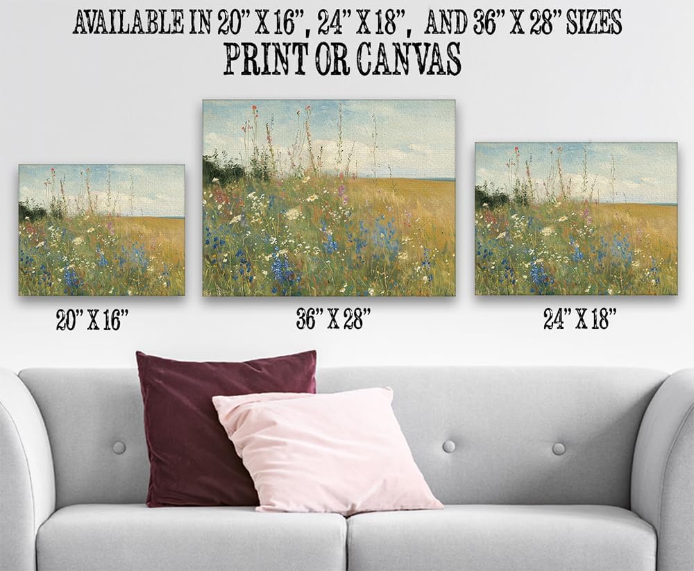 Transform your space with our captivating unframed print, a stunning Field of Wildflowers Painting poster that brings the beauty of nature to your walls. This botanical wall art, PROUDLY MADE IN TEXAS, adds a touch of vintage charm to any room, making it great for your living room or as wildflower nursery decor. The oil painting style creates a warm and inviting atmosphere, making it a great addition to farmhouse-themed interiors. This landscape art captures the essence of a picturesque field, providing a vintage botanical wall art aesthetic. Elevate your decor with the timeless appeal of our Wildflower Wall Decor, a piece that seamlessly blends artistry and nature. Whether you're enhancing your home office, dorm, or game room, our ready-to-frame 18" x 24" print ensures easy integration into your space. Choose frames that complement your style and let this landscape field wall art become a focal point in your collection. Love the art or send it back – your satisfaction is our commitment. Explore the allure of botanical pictures for the room, and bring the serenity of a vintage landscape into your home.