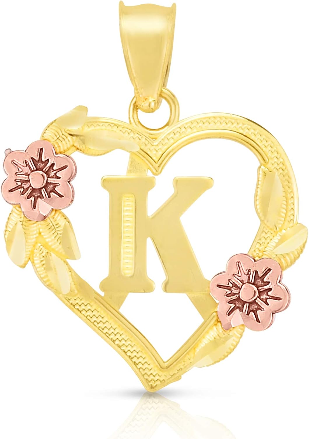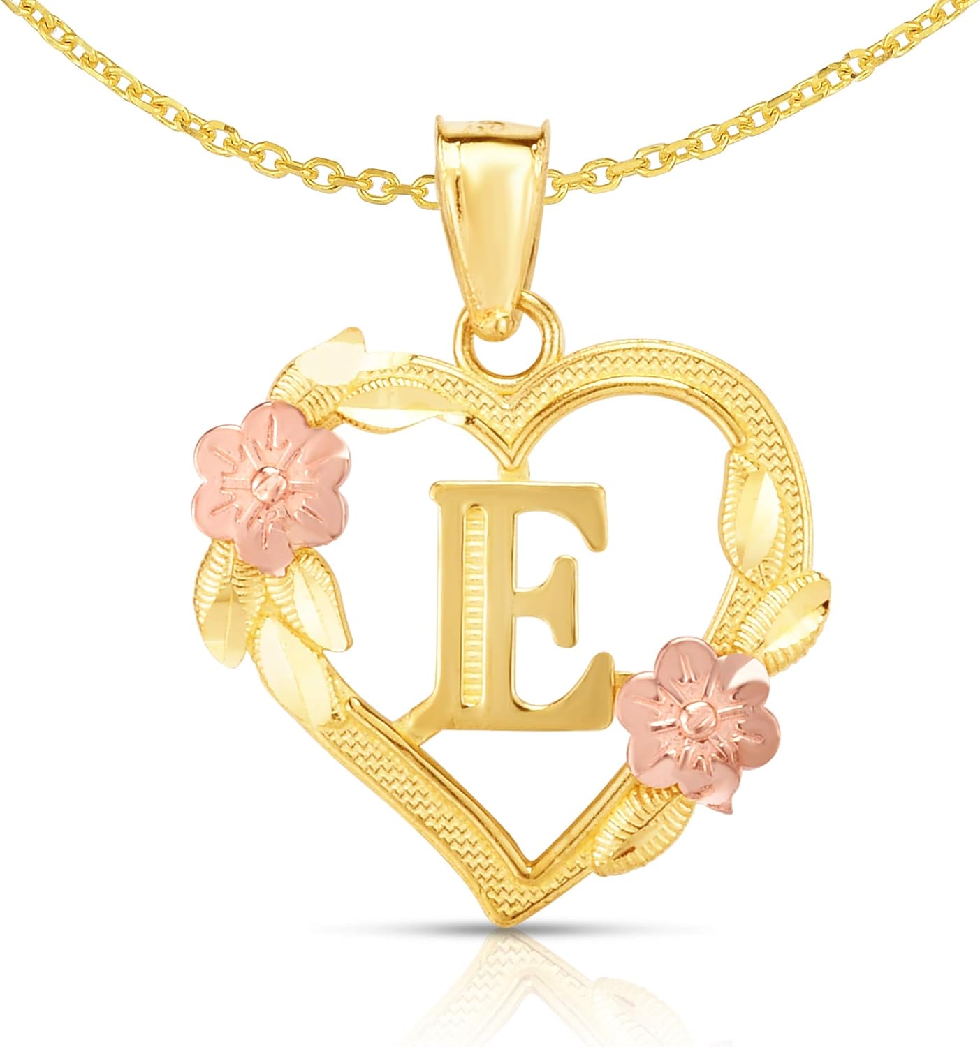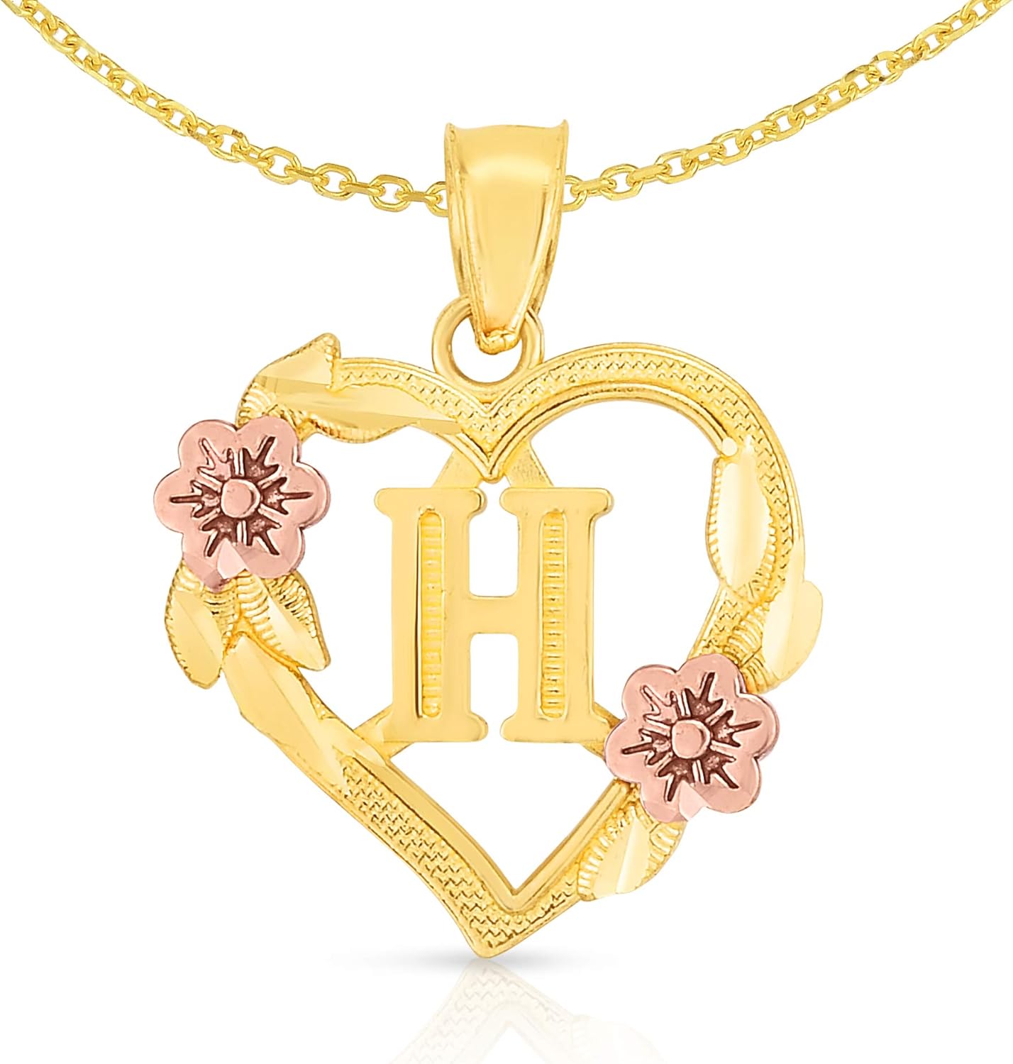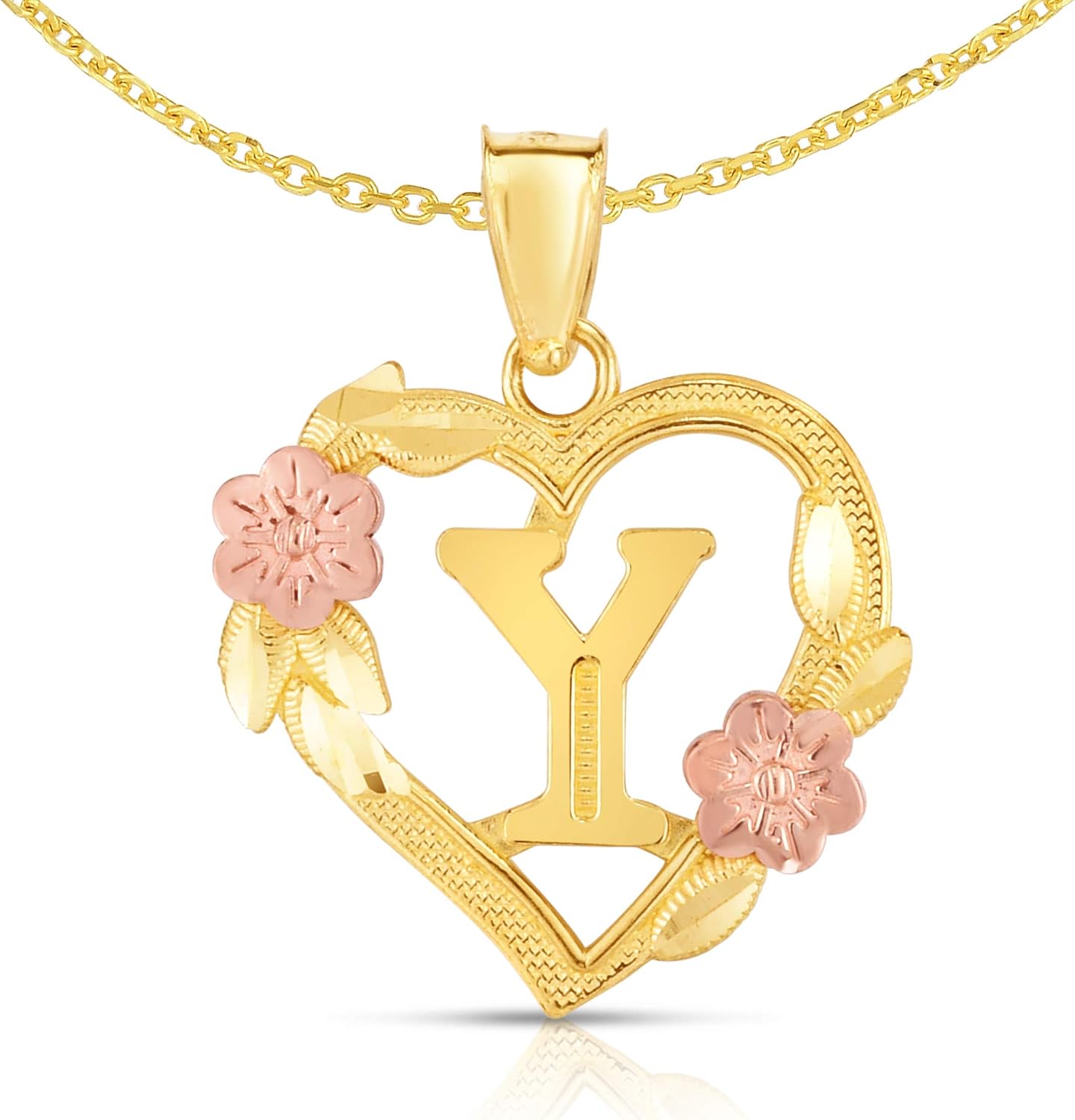 10k yellow and rose gold initial pendant for a necklace.Available in all alphabets.Framed in a beautiful two tone heart shape.Optional 10k yellow gold 18 inch solid cable chain necklace, 1.1mmDimensions and WeightHeight with bail: 19.5 millimeter (0.77 inch)Height without bail: 15 millimeter (0.6 inch)Width: 15 millimeter (0.6 inch)Weight (approx.): 0.8 – 1 gram (may vary on the letter)Necklace Dimensions and WeightLength: 18 inchWidth: 1.1 millimeterWeight (approx.): 1.4 grams