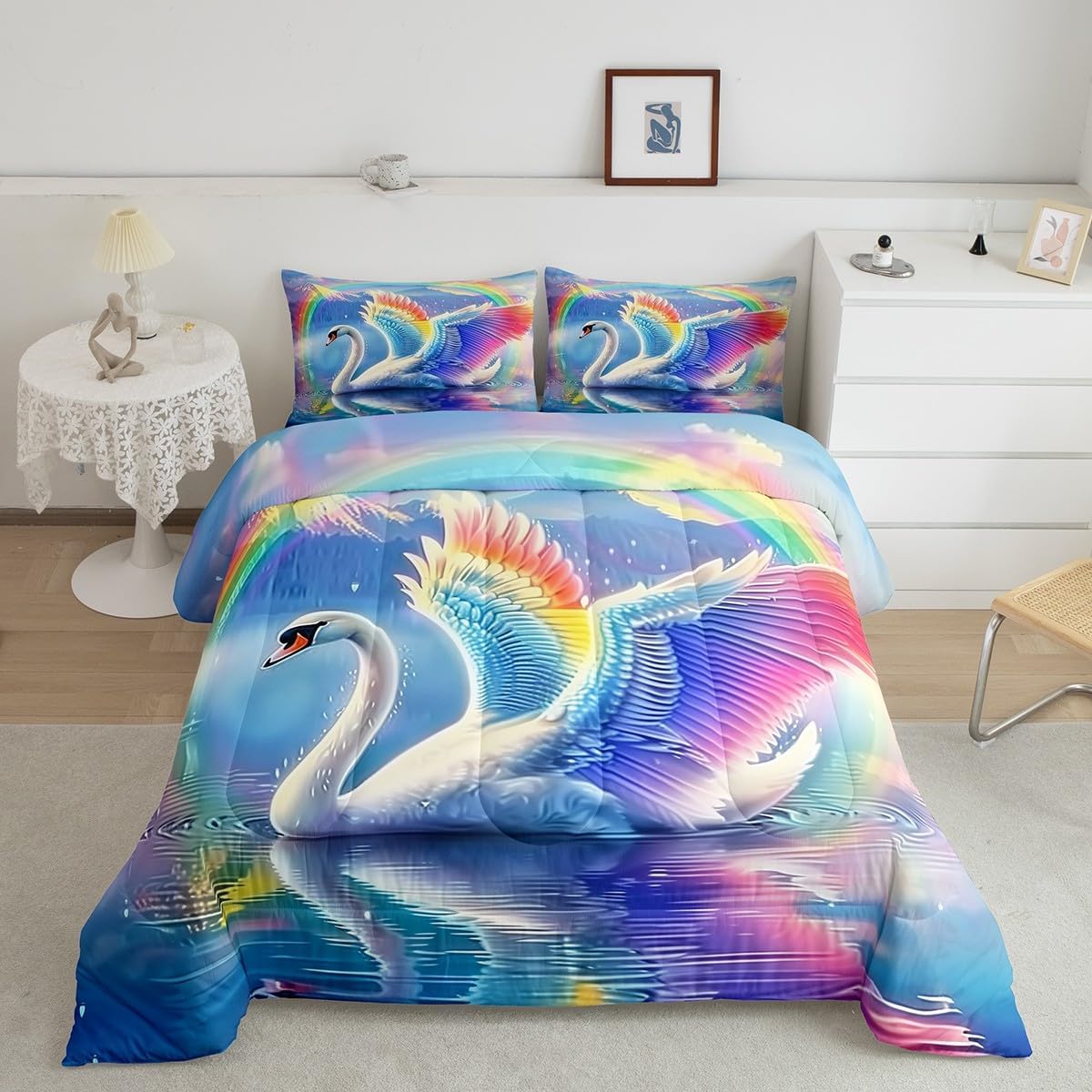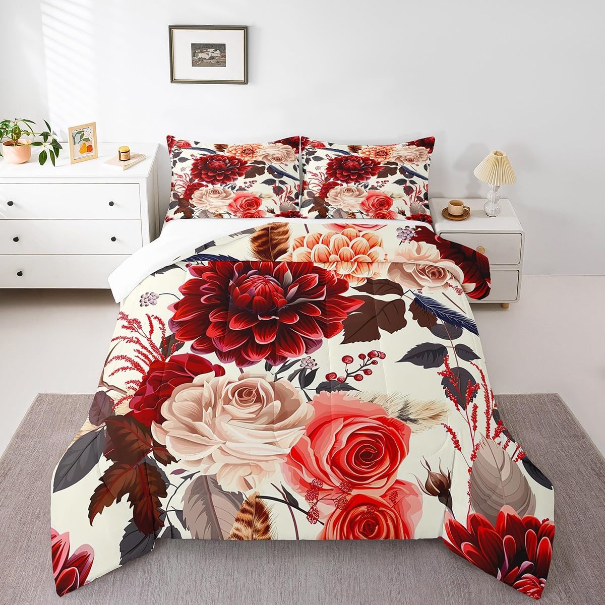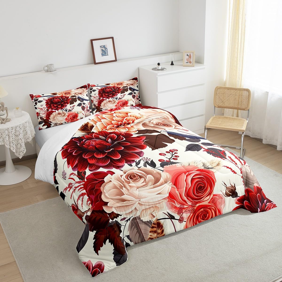 Dimensions and Contents: Toddler: Includes 1 comforter (42" x 58") and 1 pillow case (30" x 20") Twin: Includes 1 comforter (68" x 90") and 1 pillow case (30" x 20") Full: Includes 1 comforter (79" x 90") and 2 pillow cases (30" x 20") Queen: Includes 1 comforter (90" x 90") and 2 pillow cases (30" x 20") King: Includes 1 comforter (104" x 90") and 2 pillow cases(36" x 20") Design Options: Offered in a variety of styles and patterns Versatile Use: A versatile choice for master bedrooms, guest rooms, living areas, or camping car Printing Technique: Crafted using reactive printing and dyeing methods for vibrant design. Care Instructions: Machine washable.Air dry it or use an iron on a low heat setting Decorative Purpose: Designed for home furnishing and decor