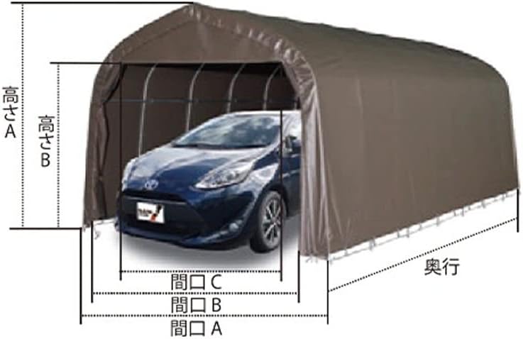 One box type pipe garage. Protect your precious car from the wind and rain. There is no need for building permission, and you can assemble it by yourself and the base can be installed on the pavement. With years of Nankii quality and performance, it has received tremendous reliability from domestic and abroad. You can assemble it yourself and create a nice garage in a short time. We offer a variety of replacement sheets at a low cost. It protects your car from the rain, wind and dust from the garage. Besides garages, it can also be used as a storage space or work space. Disassembles for easy transportation and storage. This product requires assembly. Product number: 3256U MSV Size: Frontage: A: 10.8 ft (3.20 m), B: 10.8 ft (3.02 m), C: 6.9 ft (1.83 m), Height: A: 8.5 ft (2.50 m), B: 6.6 ft (2.08 m), Depth: 16.2 ft (5.60 m). Installation Method: Embedded Number of arches: 8 Pipe diameter: 1 inch (25.4 mm) Color: MSV (metallic silver). Note: Comes with front and back curtains, side opening. Quantity: 1 set
