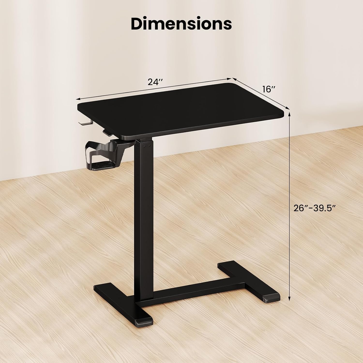 Description:Elevate your home workspace with our versatile C shaped side table, meticulously designed to enhance both functionality and style. With an easy-to-adjust height ranging from 26" to 39.5" through a smooth gas spring pneumatic lift, it's simple to customize your workspace to your ideal comfort level, whether seated or standing. A rotatable cup holder and a convenient hook are also provided to meet your additional storage needs. The c shaped design and hidden swivel casters enable this table to fit seamlessly beside your bed or sofa, helping you to make better use of your space. The simple yet modern can perfectly accomplish your living room as well as your bedroom for the better.Features:Wide tabletop suitable for laptop, iPad, snack, lamp and bookConvenient hook for hanging personal itemsRotatable cup holder for secure beverage placementHook and cup holder can be assembled as per individual requirementCustomize your workspace with ease by adjusting the heightAdjustable height from 26” to 39.5” via a gas spring pneumatic lift systemCompact C-shaped design fits alongside the bed or sofa, maximizing spaceEffortless mobility with a lower stylish base and 4 hidden swivel wheelsConstructed with a heavy-duty metal frame for durabilityEasy-to-clean surface ideal for everyday use and easy maintenancePerfect as a standing desk, sofa side table, or overbed tableSpecifications:Color: Black/Natural + White/WhiteMaterial: Engineered Wood + MetalOverall Dimensions: 24” x 16” x 26”-39.5” (L x W x H)Distance Used Deep into Sofa or Bed: 16”Net Weight: 17.5 lbsWeight Capacity: 90 lbsPackage includes:1 x Standing Desk1 x Instruction