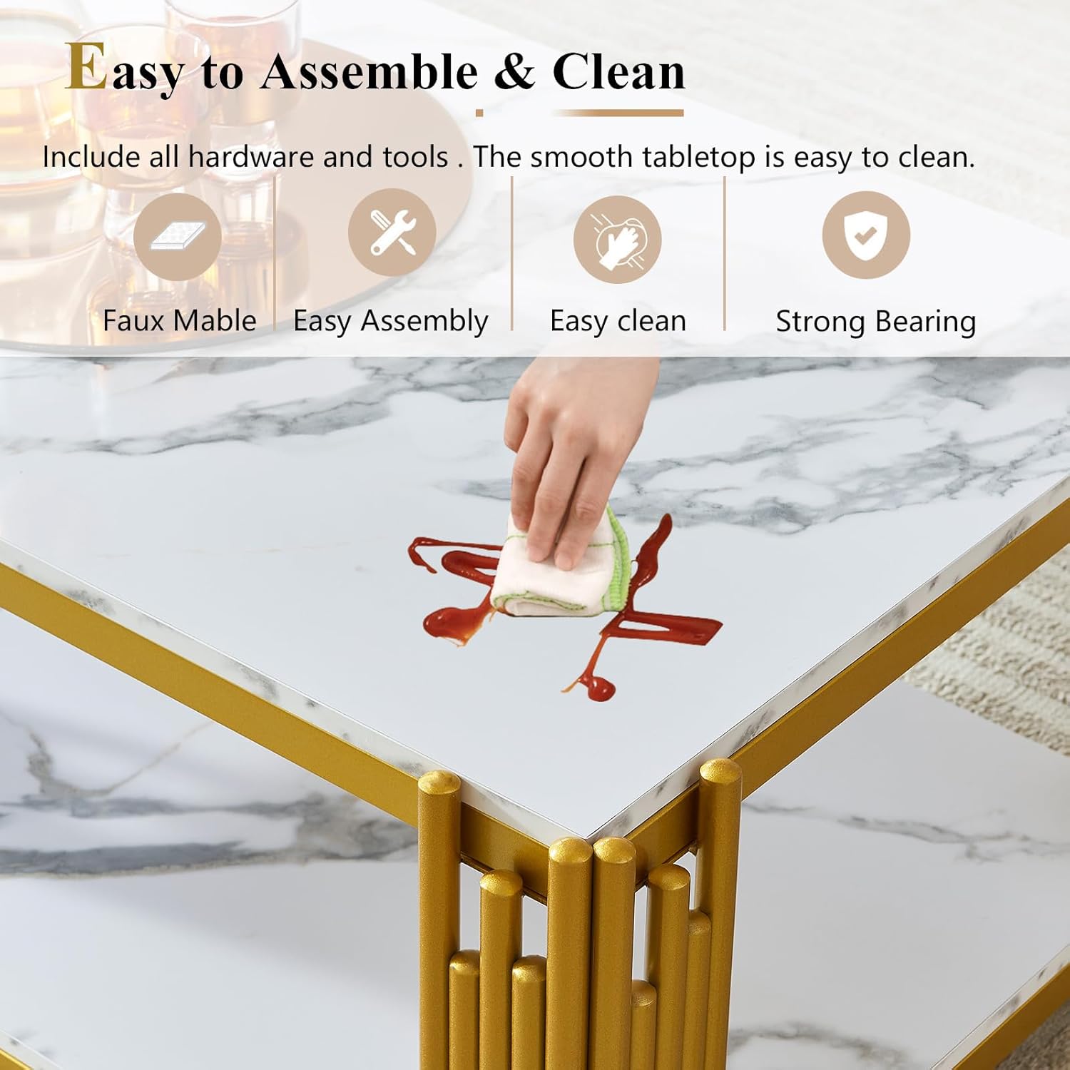 Bring a beautiful touch of modern to your home with the living room table set. With two shiny faux marble shelves and Irregular cylindrical metal pipe welding, this coffee table is designed to stand out in your home. Add a pop of industrial chic to your home with this striking coffee table/end table/console table. Faux marble and metal material are easy to clean and durable for beauty that will last. The coffee table/end table/console table in the collection with decent size to perfectly fit your home. Key Features: 1. More Storage Space: It comes with two tiers in faux marble which would maximize your storage demand as well as wouldn't take up too much space. 2. Luxury Design: Gold and black metal frame structure, suitable for different home occasions 3. Sturdy and Long Lasting: Using metal and mirror finish to ensure the console table always keeps its shine and long using time. 4. Easy to Clean: Faux marble top is easy to clean when it gets dirty, just wipe it with clean water. 5. Simple Installation: All hardware and assembly instruction are provided, one person can easy to install within a short time. Specification: 1. Coffee Table dimension: 48”L x 26”W x 17.5”H 2. Console Table dimension: 48.8”L x 13.4”W x 31.5”H 3. End Table dimension: 17.3”L x 17.3”W x 21.8”H 4. Material: Faux Marble+metal frame 5. Color Series: white gold/white black