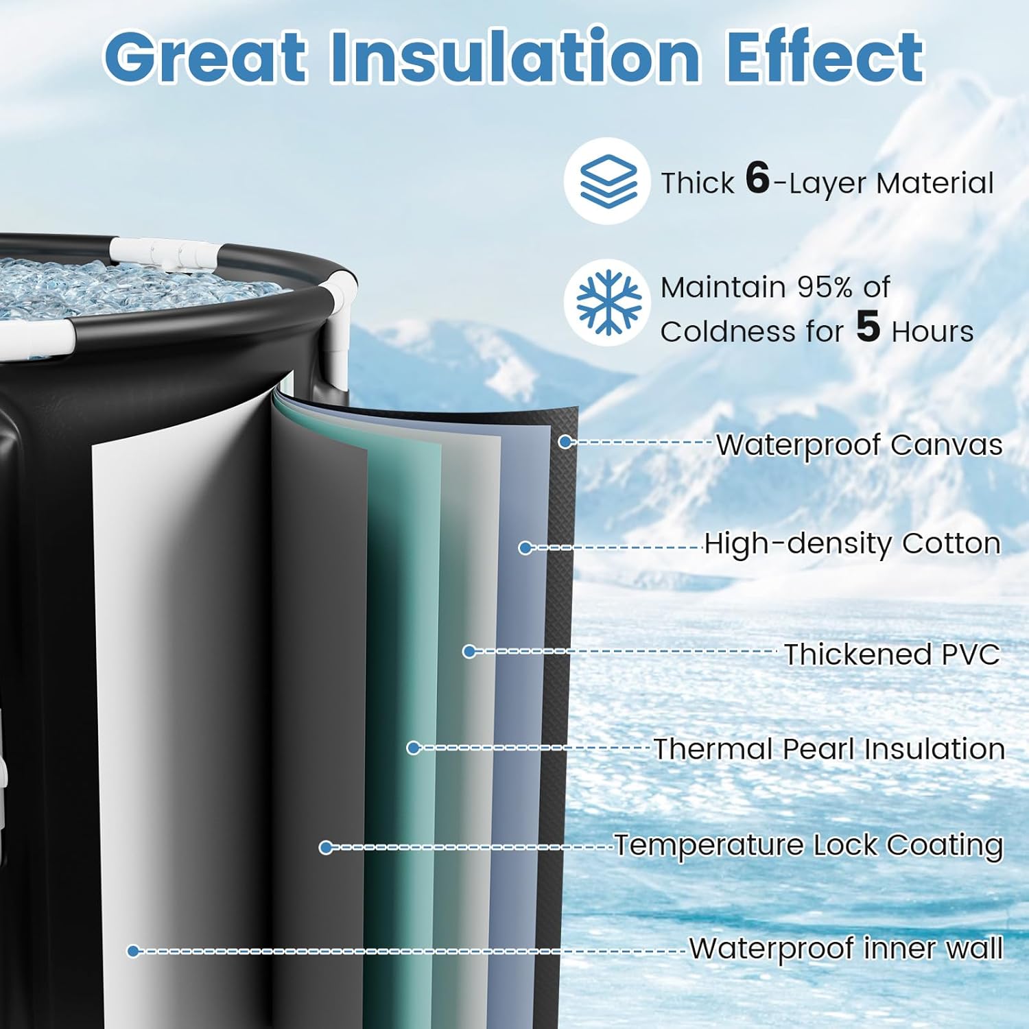 Discover the Ultimate Solution for Your Post-Workout Recovery! Featuring an innovative design that allows for quick and easy setup with just 6 clicks on the support rods, this ice bath tub is a game-changer in terms of usability. The 6-layered construction provides exceptional thermal insulation, which could keep water temperatures stable for a long time. Besides, the tub is supported by 6 thickened rods on the side, ensuring good strength and stability with no collapse or no damage. Essential accessories like a protective lid, a convenient drain-down valve and pipe, and a comfy seat cushion enhance the user experience, each carefully chosen to simplify and enrich your ice bathing routine. Designed primarily for athletes, fitness enthusiasts, or anyone engaged in physically demanding activities, this ice bath helps hasten recovery time, decrease muscle inflammation, and increase overall well-being, making it an indispensable addition to your fitness regimen.