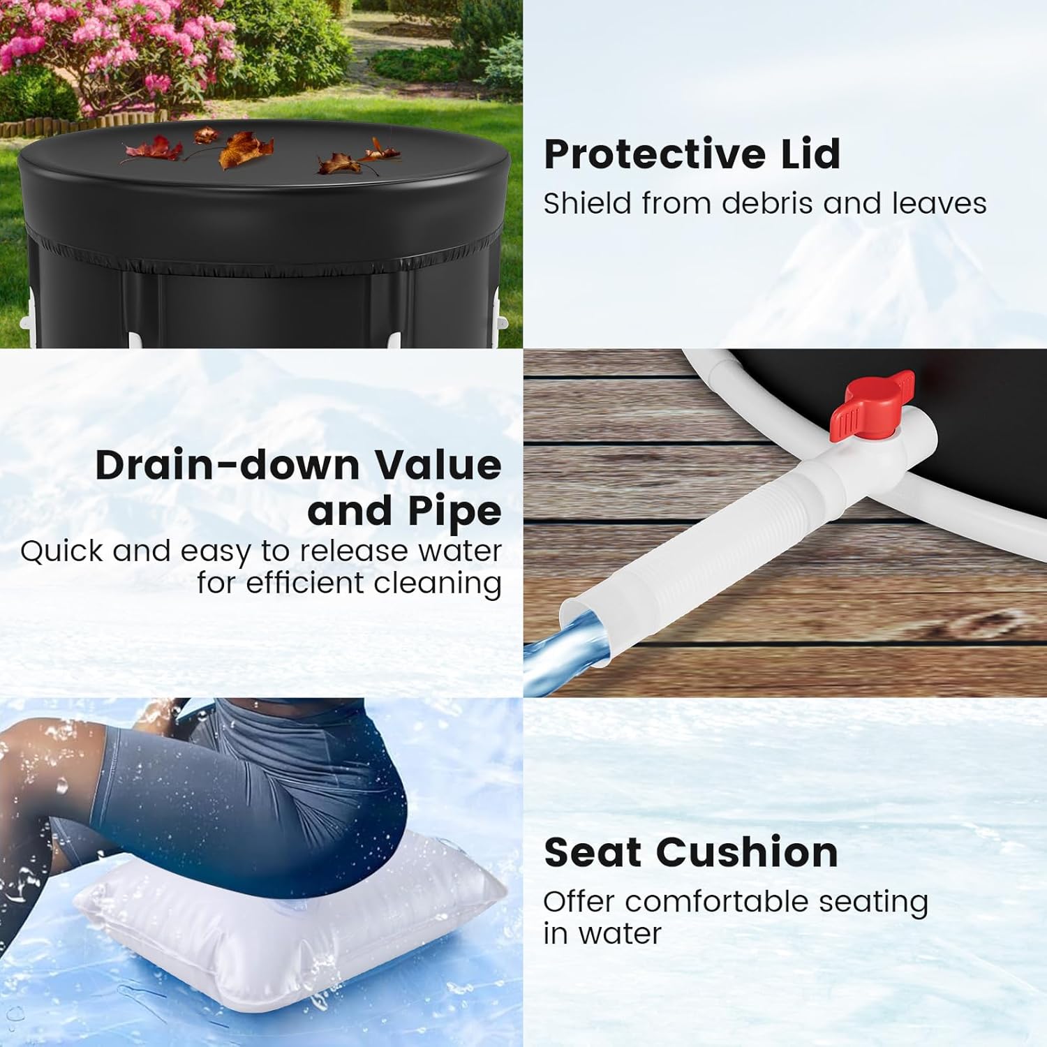 | Included Components | 1 x Drain Pipe, 1 x Drain Value, 1 x Foldable Bathtub, 1 x Lid, 1 x Seat Cushion |