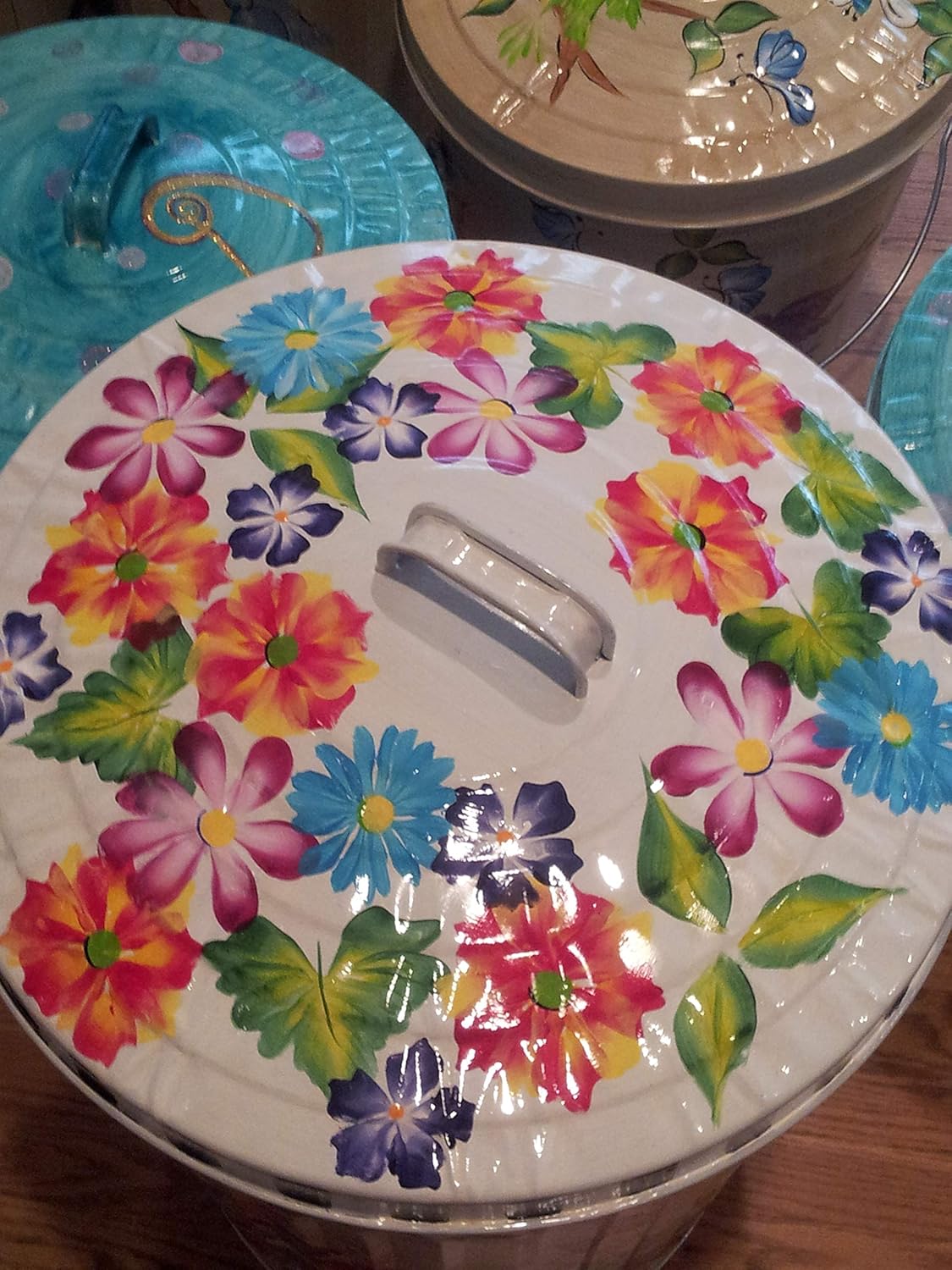 | Color | Caribbean blue medium wash - daisy, greenery - black and white checked base with gold dragging - same pattern on lid rim |