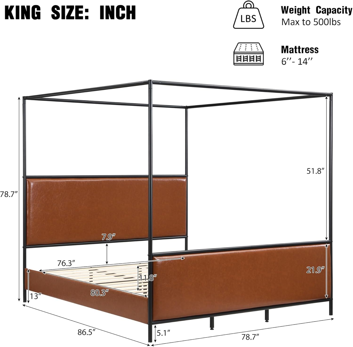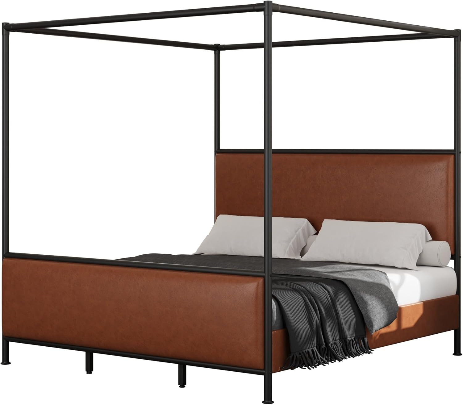 A statement in sculptural form, this canopy bed features an open design, sleek straight legs, and a durable bronze bed frame that adds height and elegance to any space. Its airy profile creates visual balance while enhancing vertical room presence. Place of Origin:China Main Color:Brown+Black Main Material:Plywood,PU Leather,Steel,Upholstered Product Dimensions:86.46''L*78.74''W*78.74''H