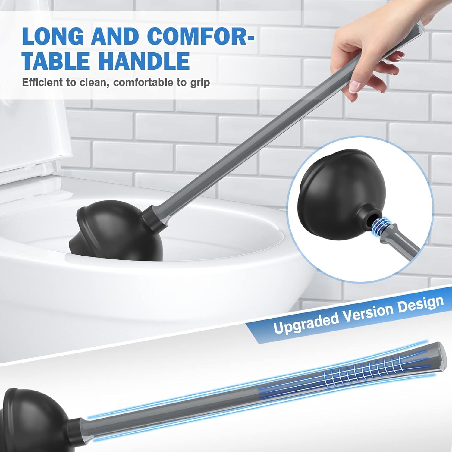 This elegant and stylish toilet plunger and bowl brush combo combines compatible plunger, unique ventilated holder and comfortable brush handle into one whole set, which can be an elegant decor and save space for your bathroom. We not only focus on the cleaning of your toilet or bathroom, but also consider the neatness of the toilet brush itself. This plunger designed with a 5.7 inches diameter suction cup is compatible with most drain sizes. There are two ways to use this plunger. You can pull out the extended rubber to clear toilet clogs. In the other way, you can fold up rubber to use for shower drains and sinks. A handy helper, the heavy-duty toilet plunger creates an ultra-tight seal around the drain, providing maximum plunging power for clearing tough clogs in toilet bowls, shower drains, and sinks. Unlike other toilet brush and plunger holders, ours has a built-in drip tray designed to collect water and keep floor dry. At the same time, an upgraded ventilated holder can allow water to evaporate so to keep brush and plunger dry. This ergonomic handle is designed for a convenient, comfortable grip. Compared with other handles, this comfortable handle is designed with a large and long grip, which makes your cleaning easier and more convenient. What's more, the 16 inches brush handle and 19.5 inches plunger handle help keep your hands clean when using a toilet brush or toilet plunger. Brush head is made of soft, flexible, and dense PP bristles so that the round brush head delivers a more thorough cleaning. Note: You need to pull out the extended rubber from toilet plunger before you use.