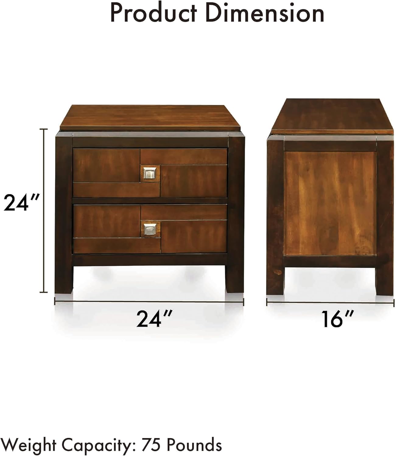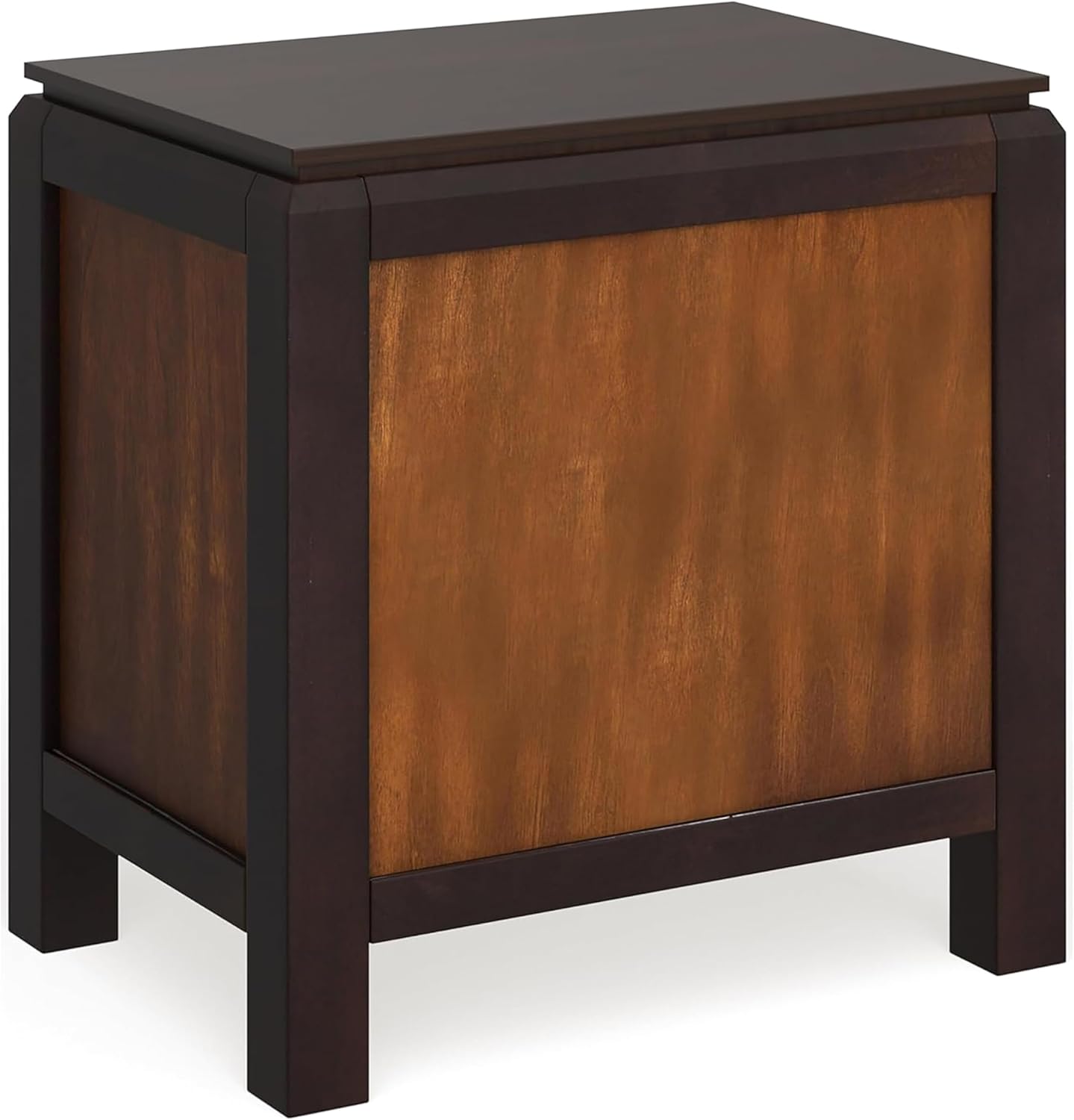 A contemporary gem with a distinct look, this nightstand is sure to enhance any space. Acacia panels adorn the drawer fronts, and wooden block feet provide a modern touch. Finished in walnut. Product frame is constructed from solid wood and wood veneers. Wipe clean with a damp cloth. Assembly required. Spot clean recommended. Minimal assembly required. Product made in Viet Nam. Once assembled, product measures 24 inches wide by 17 inches deep by 28 1/3 inches high; 30-days hassle-free replacement parts warranty. Pictures are for illustration purposes. All décor items are not included in this offer.