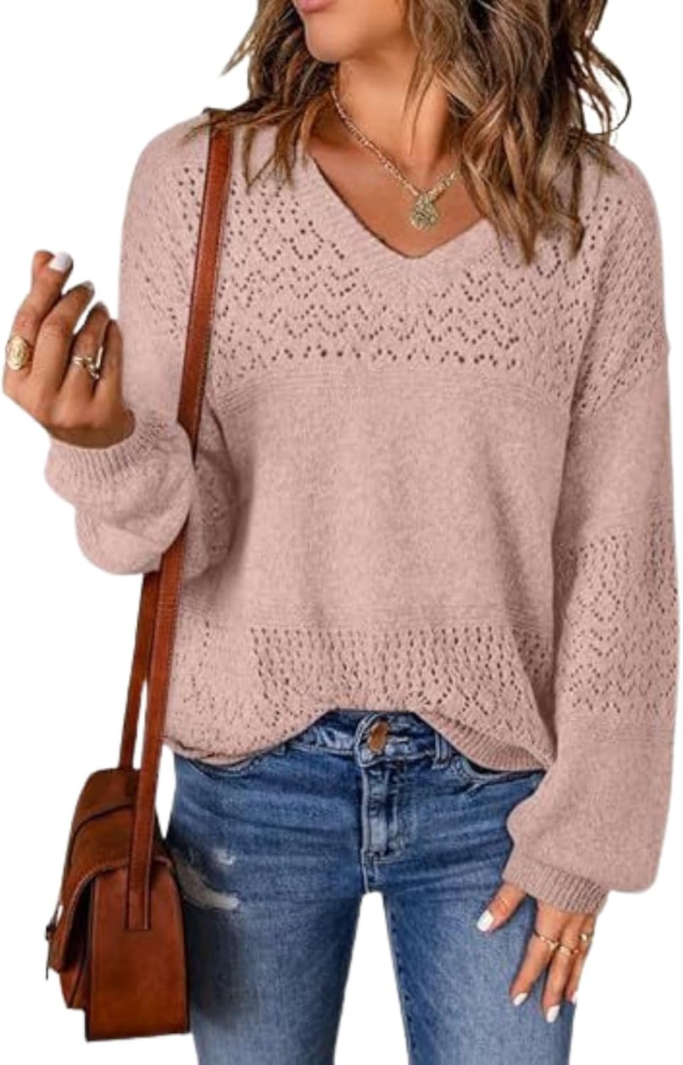 HOTYD Fashion Hollow Sweaters for Women V Neck Long Sleeve Lightweight Knit Crochet Pullover Top Fall Loose Casual Sweater