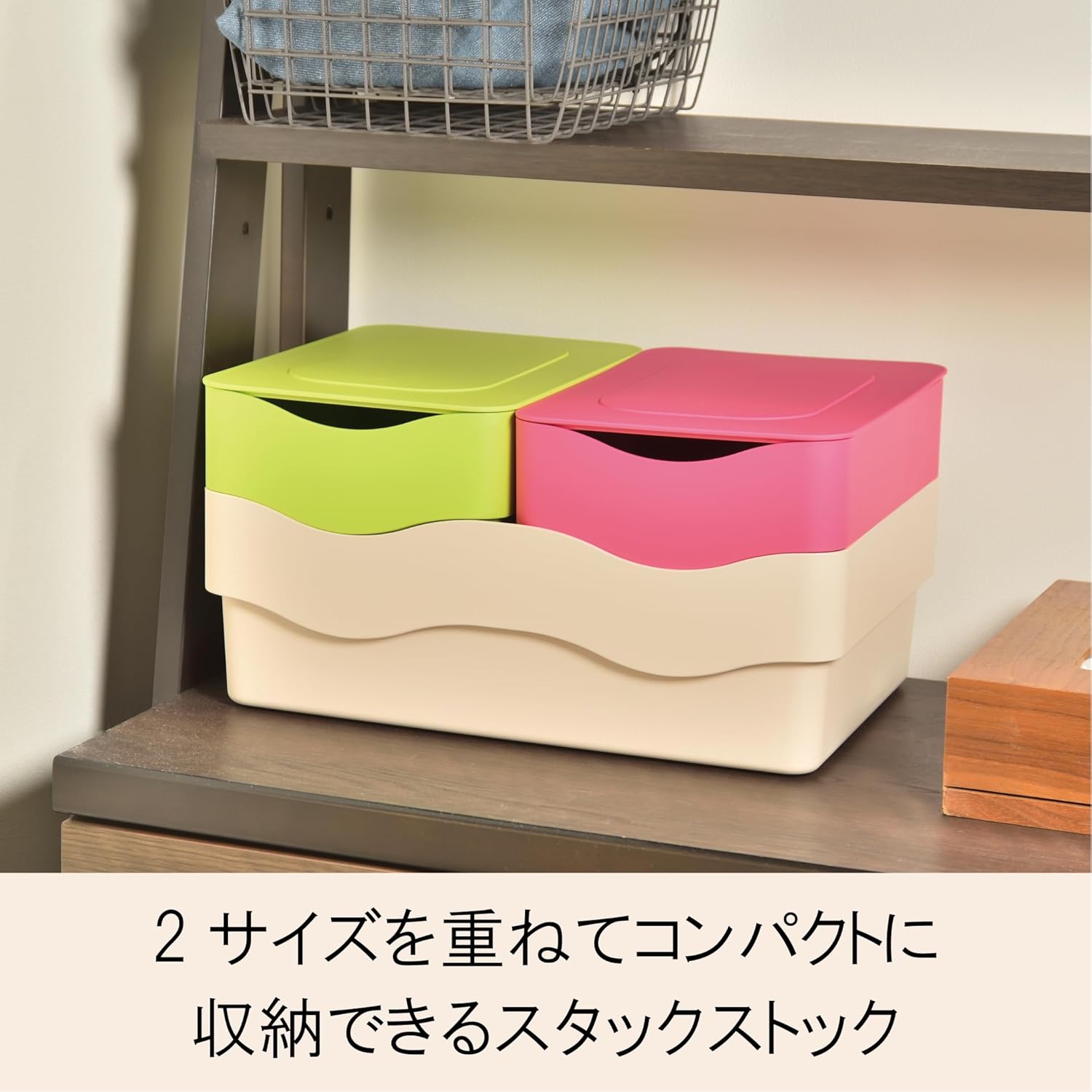 Stackable with included lid and easy pull out stacking up and down The shape of the design is different between the front and the back of the box, so you can enjoy 2 different designs by stacking. It is also sized to fit most color boxes. W 7.5 x D 10.6 x H 5.3 inches (W 191 x D 27Material: Polypropylene