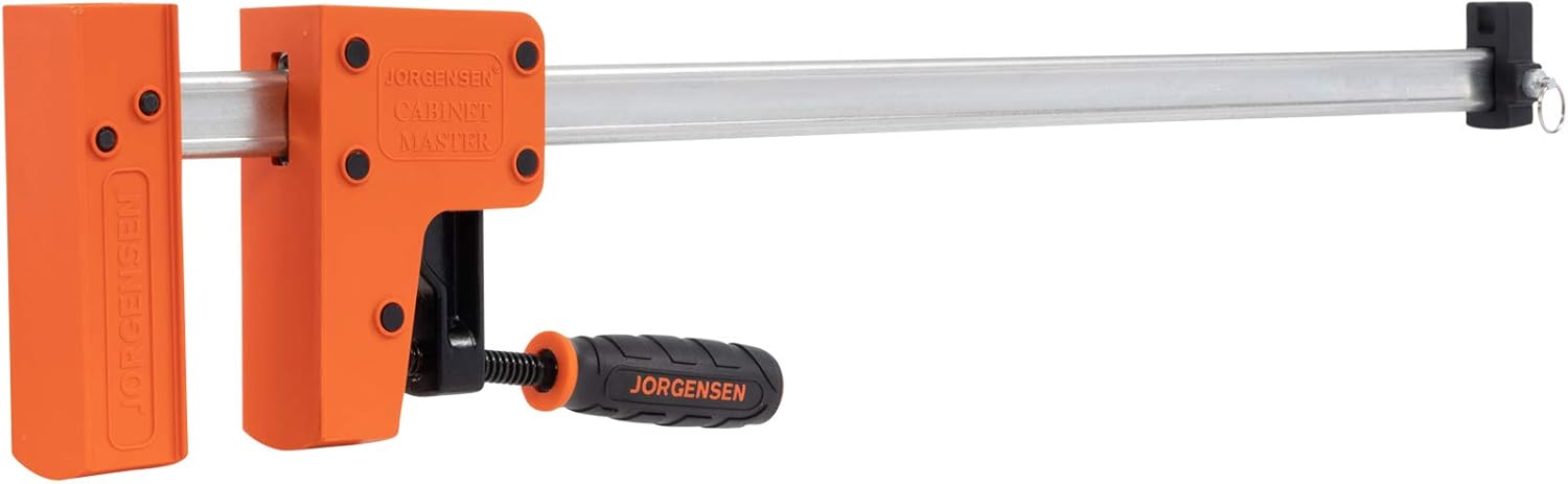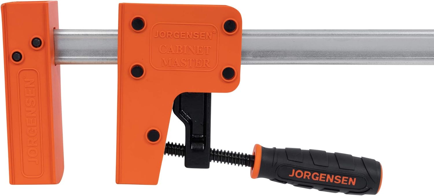 The JORGENSEN Cabinet Master Bar Clamps are ideal for flat panel, box, cabinet, frame and panel doors assemblies or any other project that requires squareness or evenly applied pressure. Large plastic jaws assure the distribution of clamping pressure over large areas. The jaws stay parallel to assure squareness and prevent work pieces from bowing or lifting. Built in clamp stand allows clamps to stand upright for one handed use and easier/quicker sliding head adjustment. The sliding head can be reversed on the bar and the clamp then acts as a spreader. Opening capacity is 24 inches, clamping faces are 3-3/4" height and 1-7/8" width, high-carbon steel bar is 1-3/16" X 3/8", screw is 5/8" cold-drawn steel with special, smoothly cut ACME threads, large easy to grip handle and load limit is 1,000 lbs.