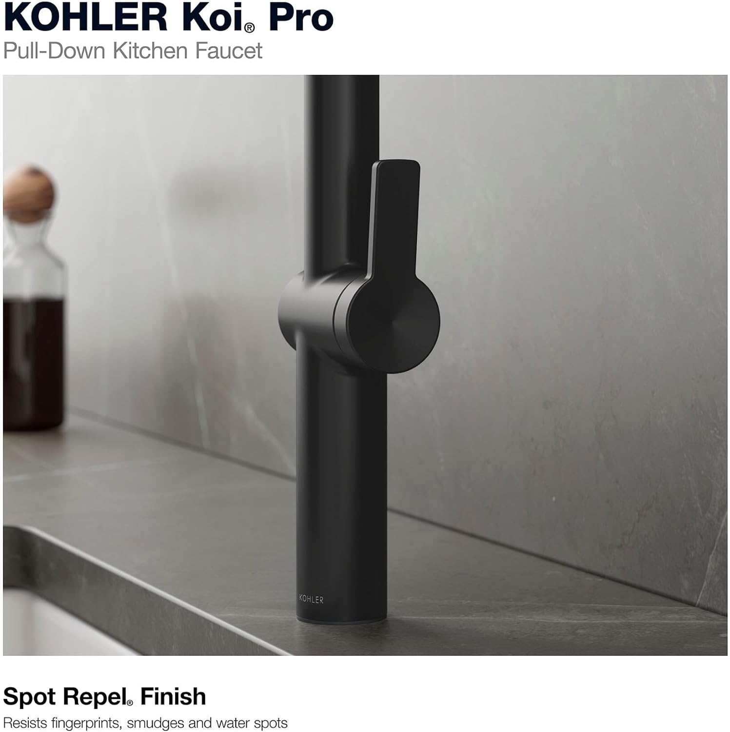 KOHLER Koi Matte Black Single Handle Pull-Down Kitchen Faucet with Deck Plate and Soap Dispenser (R26735-SD-BL)