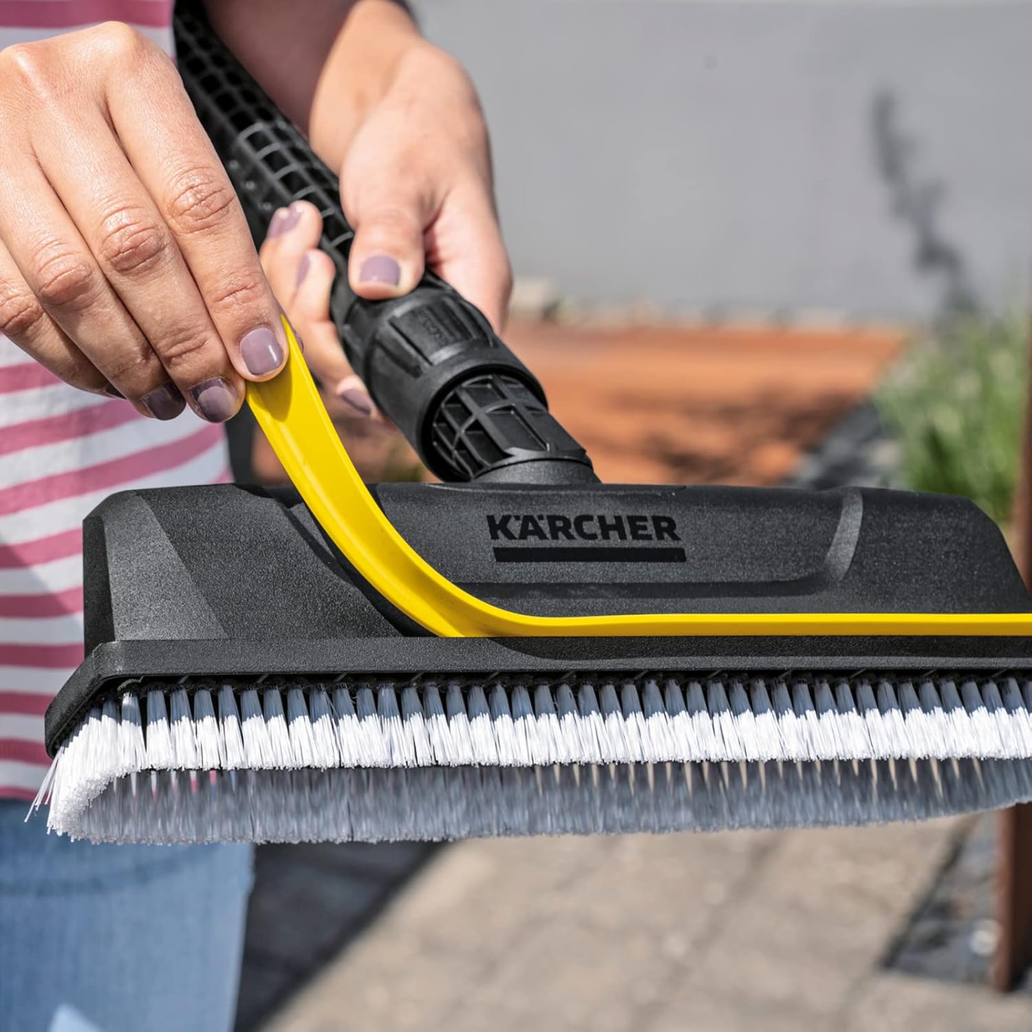 The PS 30 power scrubber provides outstanding cleaning results on a variety of surfaces - use anywhere from driveways, sidewalks, decks, and patios, to stairs and tight corners. Using three high-pressure nozzles to loosen even the most stubborn dirt, the PS 30 the ideal pressure washer accessory for efficiently cleaning small to medium-sized areas, such as stairs and patios. The brush head can be rotated 360° to clean even the hardest-to-reach areas. Smooth surfaces can be squeegeed with the integrated dirt blade once finished cleaning, which removes excess dirty water quickly and significantly speeds up surface drying time. This combination of high-pressure jets with manual brushing pressure results in outstanding cleaning performance which outperforms all standard scrubbers. The PS 30 Power Scrubber can be combined with all Karcher series K 1 to K 5 pressure washers.