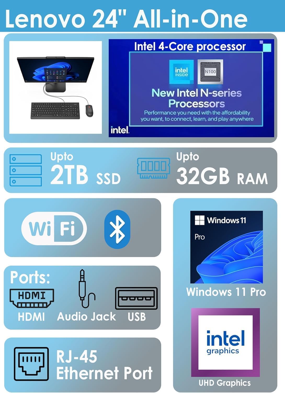 General Brand: Lenovo Color: Cloud Grey Memory: 16GB DDR4-3200 RAM Storage: 512GB SSD M.2 PCIe NVMe Operating System: Windows 11 Processor Processor Manufacturer: Intel Processor Model: Core i3-N305 Processor Speed: Up to 3.8GHz with Turbo Boost Processor Cores: 8 Cores / 8 Threads Graphics GPU: Integrated Intel UHD Graphics Graphic Type: Integrated Graphics Display Screen Size: 23.8 Inches Diagonal Screen Type: IPS Anti-glare Resolution: 1920 x 1080 (Full HD) Brightness: 250 nits Color Gamut: 99% sRGB Design Form Factor: All-in-One Desktop Stand: Tilt Stand (-5° to 25°) Connectivity Wireless LAN: Wi-Fi 6 (802.11ax 2x2) Bluetooth: Bluetooth 5.2 Ethernet: Integrated Gigabit Ethernet (10/100/1000M) Ports & Slots 2 x USB 3.2 Gen 2 (10Gbps) Type-A 2 x USB 2.0 Type-A 1 x HDMI-out 1.4b 1 x Headphone/Microphone Combo Jack (3.5mm) 1 x Ethernet (RJ-45) 1 x Kensington Security Slot Audio & Video Webcam: HD Camera Microphone: Integrated Mono Microphone Speakers: Dual 2W Speakers Audio Chip: High Definition (HD) Audio Power Power Supply: 65W Adapter (89% Efficiency) Physical Characteristics Dimensions (W x D x H): 21.23 x 7.3 x 16.65 inches Weight: Approximately 9.47 Pounds Included in the Box: All-in-One Desktop, Wireless Keyboard, Wireless Mouse, Power Adapter Additional Features Space-Saving All-in-One Design with Slim Bezels Fast SSD for Quick Boot and Application Loading Multiple Ports for Easy Expansion and Dual Monitor Support Modern Wi-Fi 6 for Reliable and High-Speed Wireless Connectivity Elegant Cloud Grey Finish to Complement Any Room