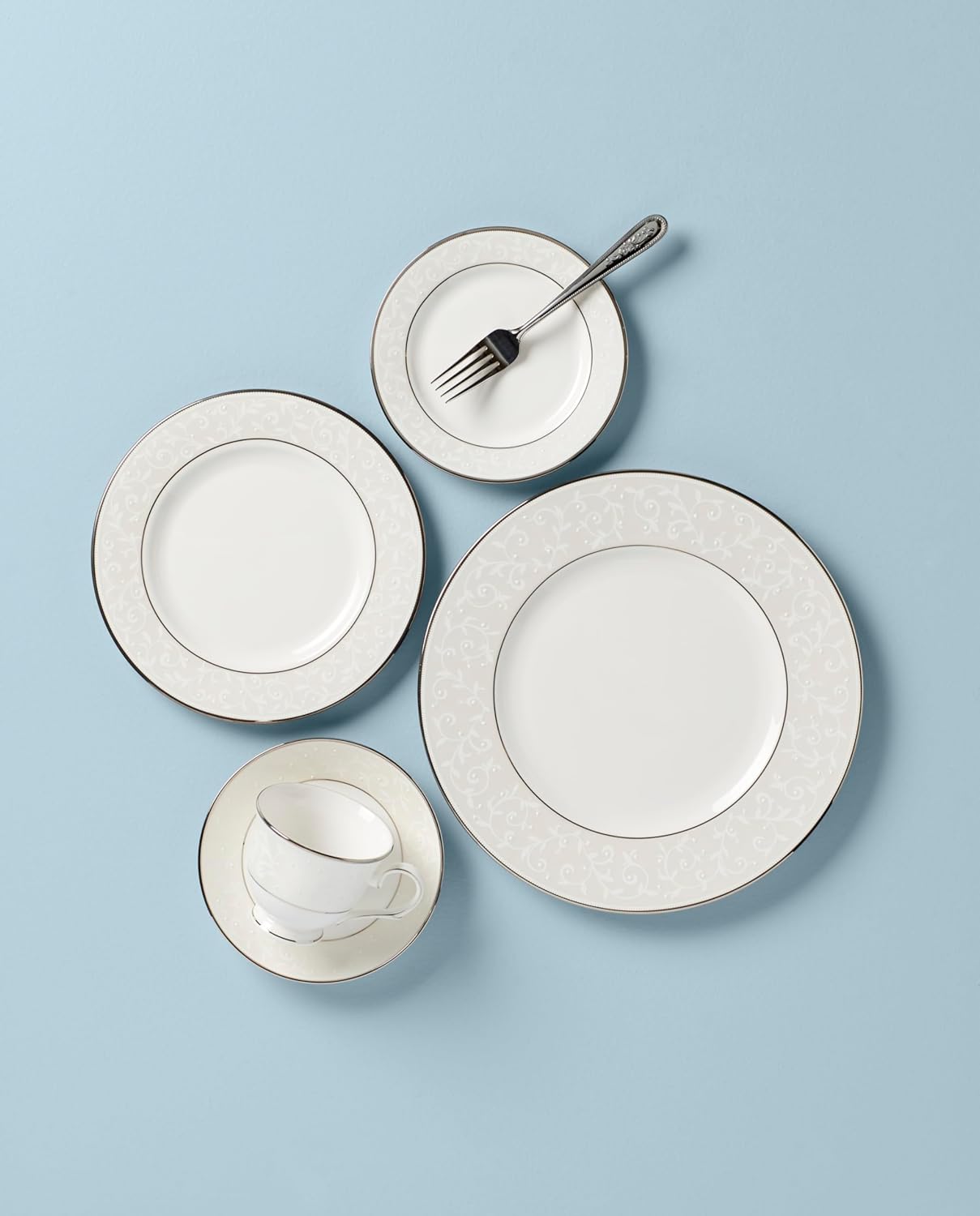 Product Description The regal and sophisticated Opal Innocence 5-piece Place Setting features a gleaming pearlescent motif of hand-applied enamel dots. Accented in precious platinum, this durable bone china place setting is dishwasher-safe for added convenience. Amazon.com The Opal Innocence place setting from Lenox creates an elegant table with intimate charm. Crafted from fine bone china, the setting features a broad opalescent border with a delicately wrought white-on-white vine motif. Hand-enameled pearl white dots look like tiny buds, while generous platinum bands add a forthright note. Five pieces in all, the setting includes an 11-inch dinner plate, 8-1/4-inch salad plate, 6-1/4 bread and butter plate, 6-inch saucer, and 3-inch teacup. The cup and saucer are markedly lovely, with curves that bring out the beauty of the pattern. Dishwasher-safe, the pattern is backed by Lenox's lifetime replacement program. Opal Innocence serving dishes are also available. --Emily Bedard