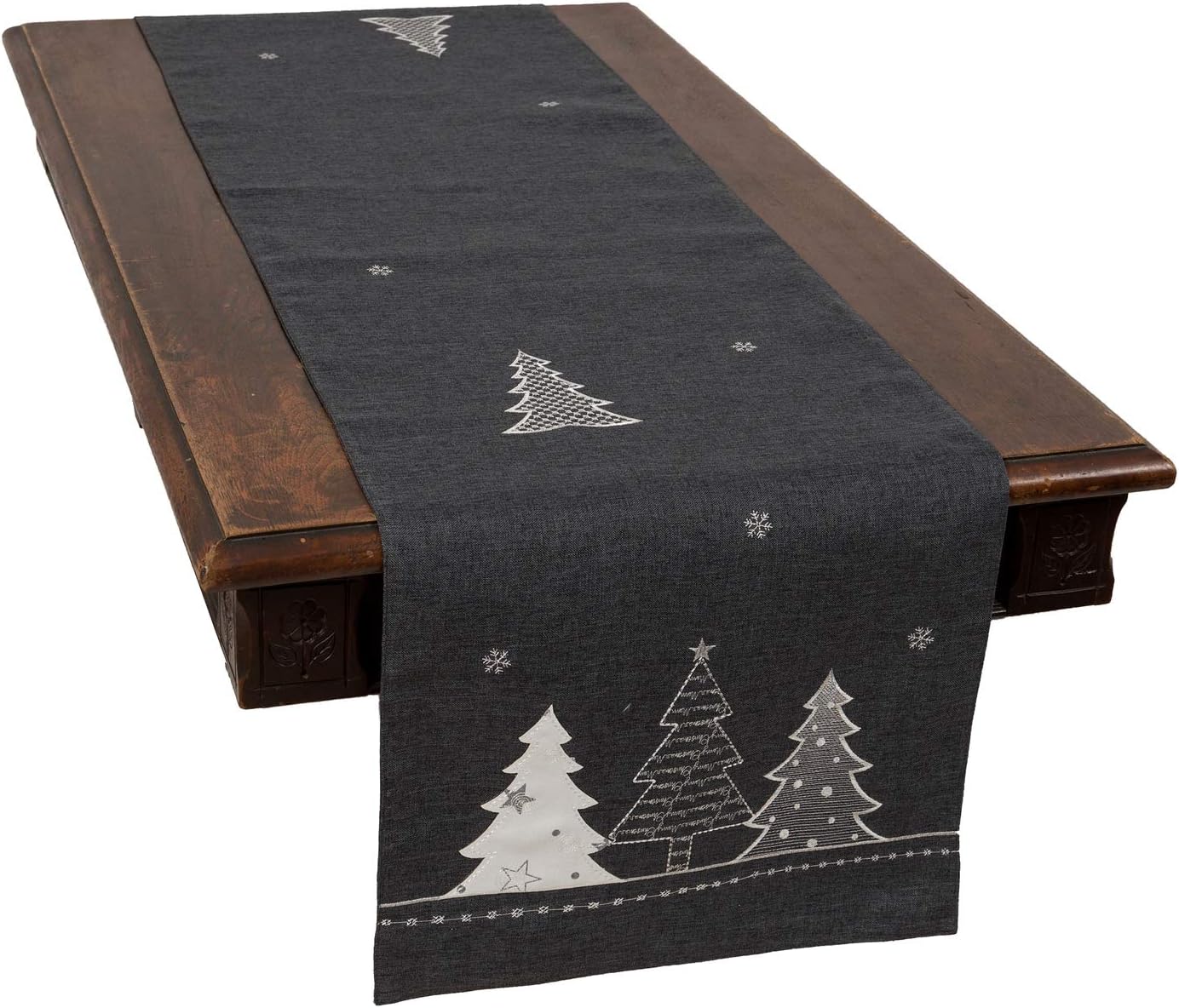 Fairytale Christmas tree with snowing embroidered on christmas red or gray back ground. Matching placemats, napkins and table runner available. Made with 100% wrinkle and stain resistant easy care poliviscose. Machine Washable. Christmas dinner will be perfectly accented with these warm and inviting holiday linens!