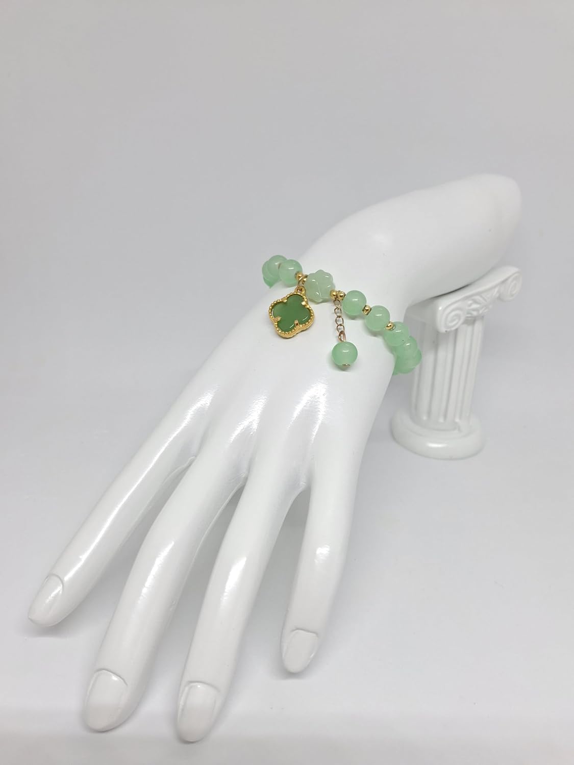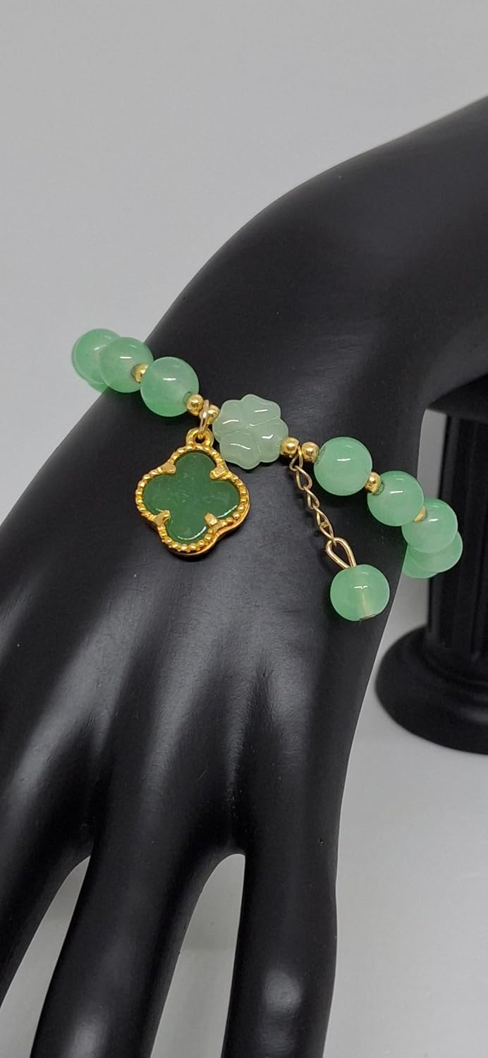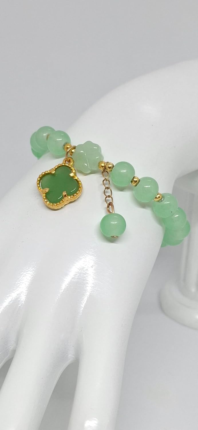 GREEN 8mm Agate Clover Leaf Stretch Bracelet Gold Plated. Apple Green Agate 8mm Round Bracelet. Jade Bracelet. Agate Gemstone Bracelet. Single Bracelet. Clover Leaf Agate LOVER. Product Info: - Stone: Agate. - Stone Color: Apple Green. - Agate size: 8mm Round. - Bracelet: Stretch Bracelets. - Metal: Gold Plated - Nice Gift Box Included