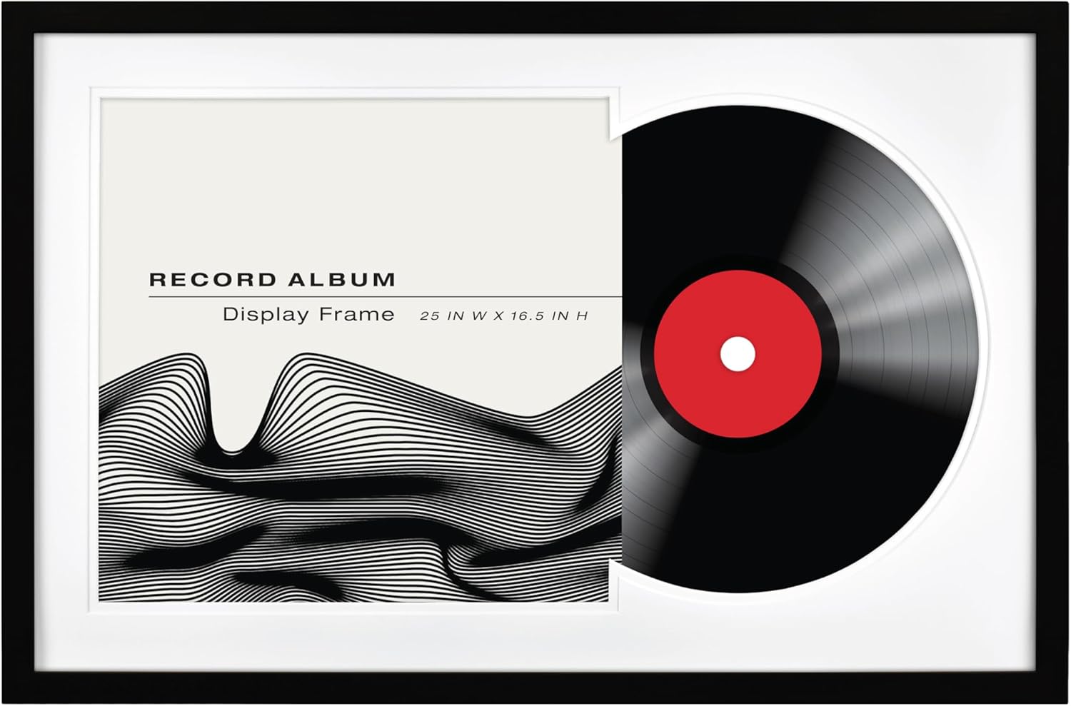 Albums are a work of art. Frame and display your favorite record albums for a one of a kind art display. The MCS 16.5x25 Inch Double Groove Record Album Frame is a sophisticated display for your favorite record albums. The double opening allows you to display both the album cover and the record together. The frame is crafted of manufactured wood, and features a traditional painted black finish. The frame features a beveled white double mat that perfectly showcases a record album cover and record album. A corrugate album holder sits inside the frame and protects the album cover and record while keeping them both perfectly in place for display. Easy to use turn buttons allow you to easily add the record to the display. The frame includes pre-attached sawtooth hangers for both vertical and horizontal album display. The MCS Double Groove Record Album Frame is the perfect gift for the record collector in your life!