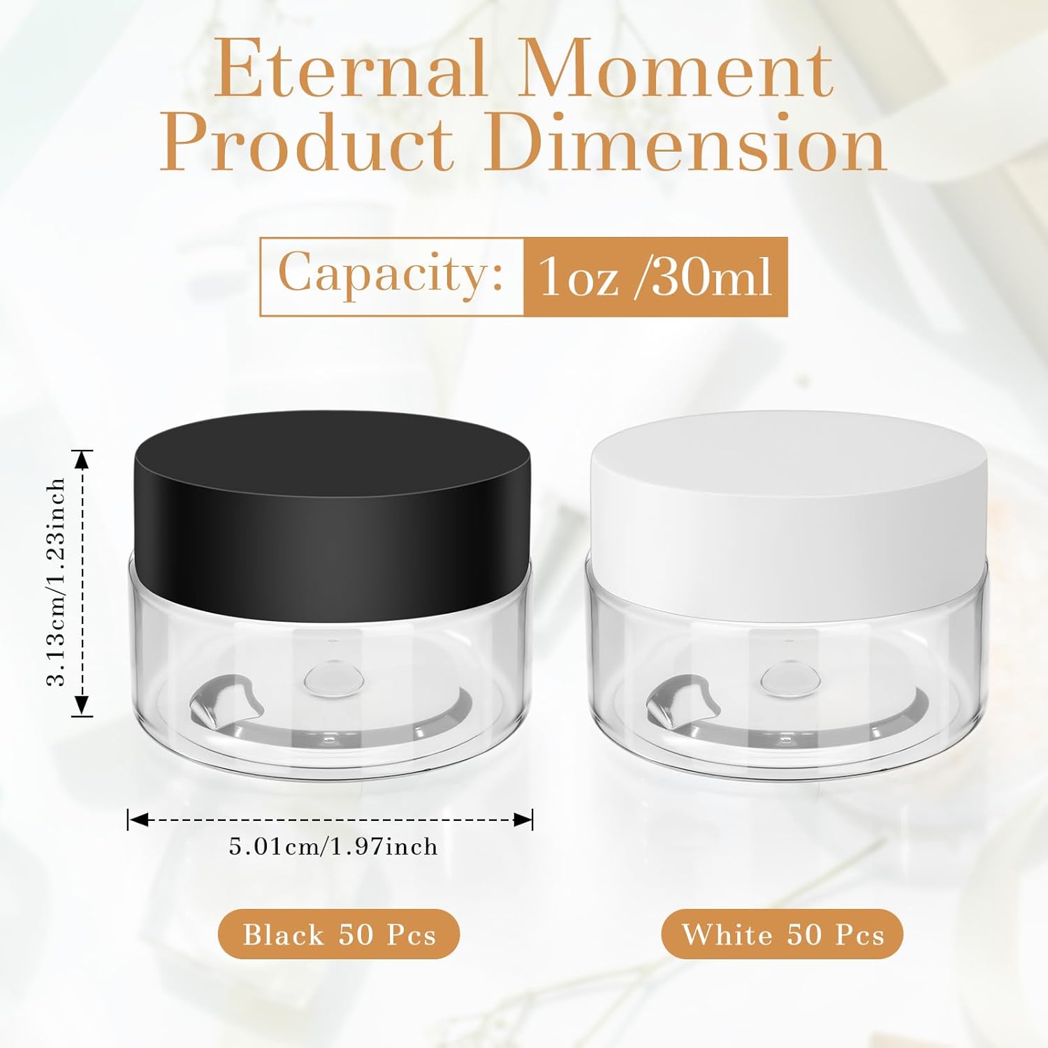 Features: Lightweight and strong: Despite their lightweight feel, these 1 oz small containers with lids are made from sturdy PET material, resisting cracks and fading. They provide long-lasting storage without adding bulk, making them a reliable choice for travel, salons, or home organization. Aesthetic appeal: The sleek, clear design of these small makeup containers with lids offers a modern look while allowing easy content visibility. Whether displayed on shelves or carried in bags, they maintain a clean, appearance while keeping your items organized. Specifications: Material: PET plastic Color: clear Size: 1 oz (30 ml) Package includes: 50 x Clear plastic jars with white lids 50 x Clear plastic jars with black lids Notes: Manual measurement, please allow slight errors on size. The color may exist a slight difference due to different screen displays