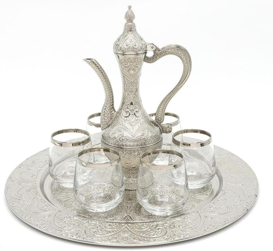 What an incredible way to serve holy Zamzam water! Features 6 cups, a circular tray with intricate, Ottoman inspired designs, and a matching water pitcher! Perfect for when hosting guests or a beautiful gift for any special occasion. WHAT'S INCLUDED: - 6 cups (each cup is about 2.25in tall) - 1 water pitcher (8.5in tall) - 1 circular tray (11.75in diameter) PRODUCT CARE: - Cups can be hand washed. Do not leave wet; dry immediately. - Do not use any cleaning, polishing, or detergent products on the metal pieces. Wipe clean with dry cloth only.Pitcher & Tray: Do not leave wet; dry immediately. Do not let water sit in the pitcher for a long period of time -- it should be used, then emptied. Pitcher should only be used with water, not with other liquids; especially not hot or acidic liquids. - NOT DISHWASHER SAFE Made in Turkey