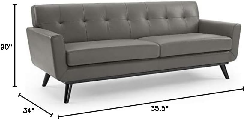 Gently sloping curves and plush removable seat cushions create a favorite living room couch. Whether lounging in solitude or entering a spirited discussion with friends, The Engage mid-century modern tufted Top-Grain leather upholstered living room lounge 90" Sofa is a welcome presence in your home. Seven buttons create eye-catching appeal, adding depth to a sleek retro modern living room sofa that brings your sitting décor to center stage. Four Splayed wood legs and frame Supply a solid base to the comfortable quality leather couch for your living room, lounge room, office or other seating area. Sofa weight capacity: 552 lbs.