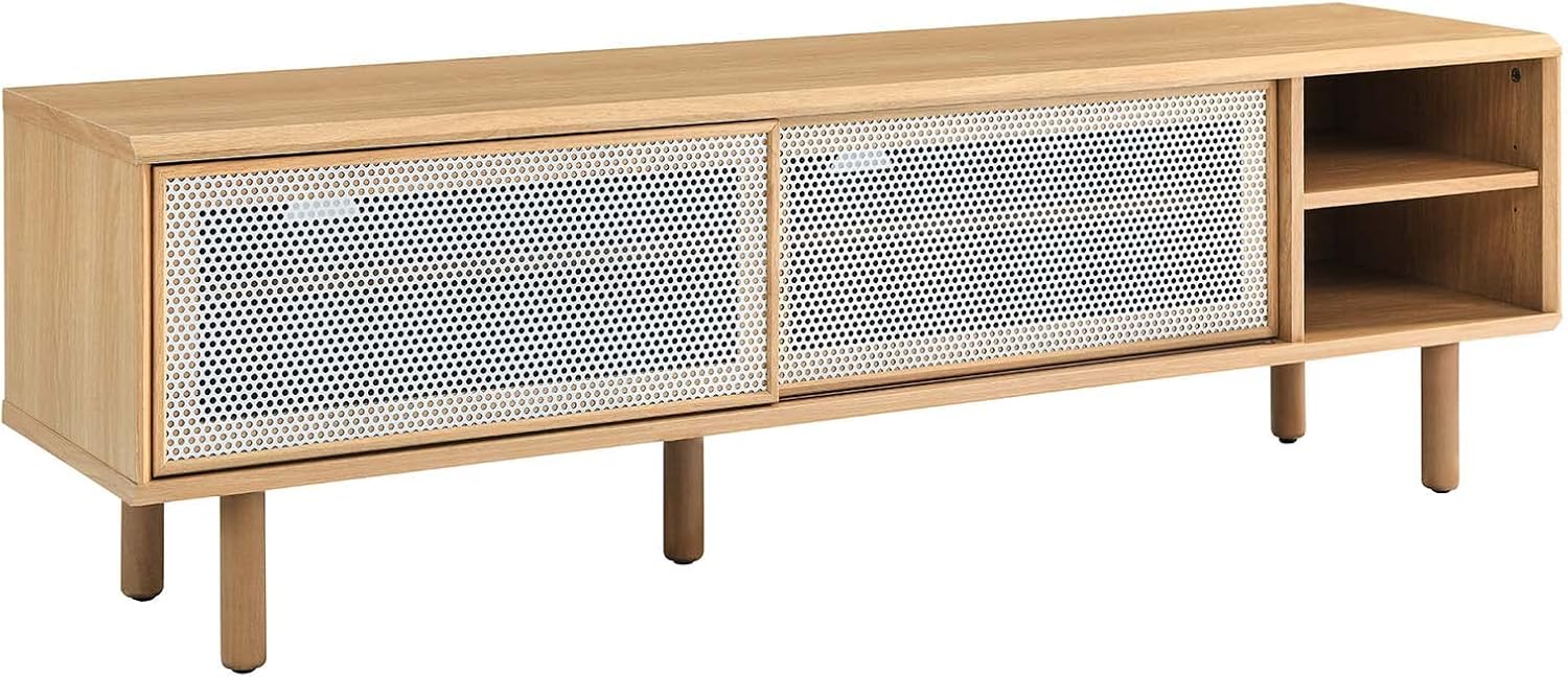 Bring urban flare to your living space with the modern design of the Kurtis 67" TV and Vinyl Record Display Stand. Featuring sliding metal mesh doors, this entertainment center brings industrial design to the living room, bedroom, home office, or lounge area. This media stand is crafted from MDF and particleboard with a natural wood grain design. Offering ample storage space for all your media essentials, this TV console features an open shelving area concealed by mesh sliding doors with cable management holes that keep things organized and allow for flow through ventilation. Display your vinyl record collection with the metal dividers on this versatile display stand. Resting on sturdy wood legs with non-marking foot pads to protect flooring, this low-profile TV stand accommodates flat screen TVs up to 65 inches. Assembly required. Weight Capacity: 200 lbs.