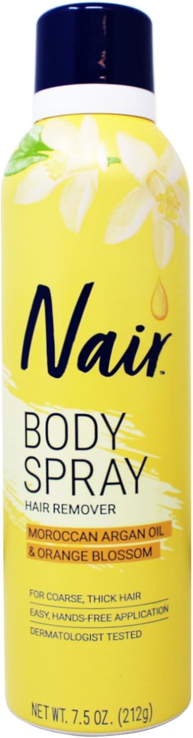 Remove hair from hard-to-reach areas with Nair Hair Removal Body Spray Just spray on this hair remover—even upside down—and let it go to work removing hair below the skin’s surface Infused with argan oil and orange blossom this body hair removal spray gives your skin and senses the nourishment they crave It’s the touch-free way to achieve touchable skin Nair painless hair removal spray can be used on the legs arms underarms and bikini area but it is not formulated for use on the face Nair arm leg and bikini hair removal spray is great for all skin types and is effective on normal to coarse hair To remove hair spray an even layer over desired areas and let rest for 4 to 10 minutes depending on hair thickness Gently wipe off the body hair removal spray and hair with a damp washcloth Once all hair has been removed rinse skin thoroughly and pat dry Make sure to patch test before using Nair offers a full range of high-quality easy-to-use hair remover products Our made-for-everyone multitasking magical formulas give you hair-free carefree skin that lasts days longer than shaving because everyone deserves to feel amazing in their own skin One 7.5-ounce can of Nair Hair Remover Body Spray easily removes hair in hard-to-reach places and even sprays upside down for spray-away hair removal in as little as 4 minutes Depilatory spray infused with argan oil and orange blossom helps nourish skin while effectively removing hair Easy-to-use painless hair removal spray rinses off in the shower and lasts days longer than shaving Formulated for arm underarm bikini area and leg hair removal; not for use on face