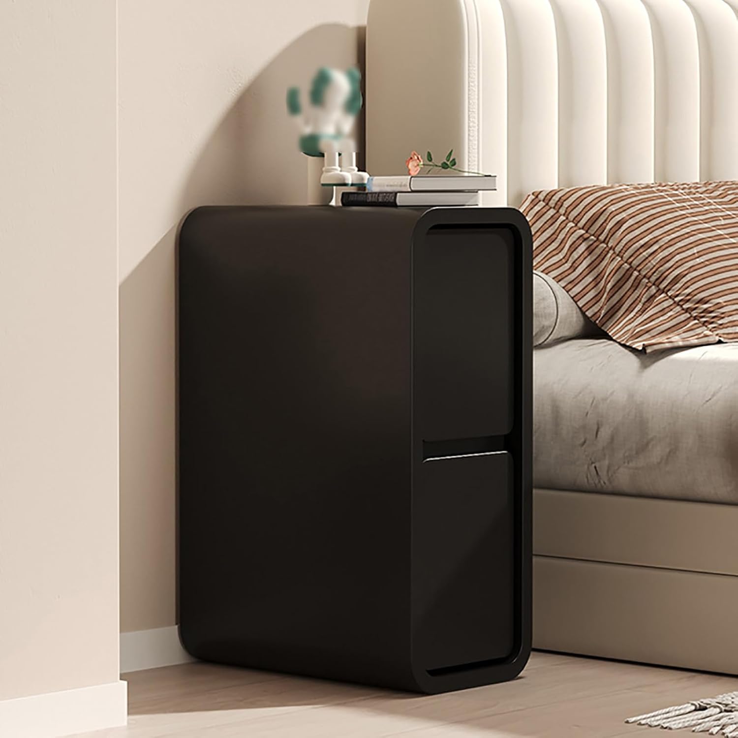 Our ultra-slim, minimalist bedside table combines the timeless appeal of solid wood with a luxurious pu leather finish, designed for small bedrooms or those seeking a refined, space-saving solution. With two deep drawers and sturdy construction, it can handle a considerable load while maintaining stabilitySpecification:Name: Narrow Nightstand Material: Solid Wood Frame with PU Leather UpholsteryDesign: Minimalist, Space-Saving, Ultra-Compact, ModernFeatures: 2 Smooth-Glide Drawers, Rounded Corners, High Load-bearing CapacitySpacious TabletopThe end table's spacious tabletop provides ample room for displaying decorative items or keeping everyday essentials at handLarge Capacity with 2 Drawers2 drawers with a tabletop are intentionally designed to allow for storage, improve space efficiency and stock management, and protect your home stuff's integrityArc DesignThe cabinet has been sanded repeatedly to avoid injuries from sharp corners bumpingNot Just a NightstandIt is a night stand at the perfect height next to the bed within arm's reach. Or you can set it as a side table or end table next to your sofa or deskPackage Contents:1 x Bedside Table with 2 Drawers