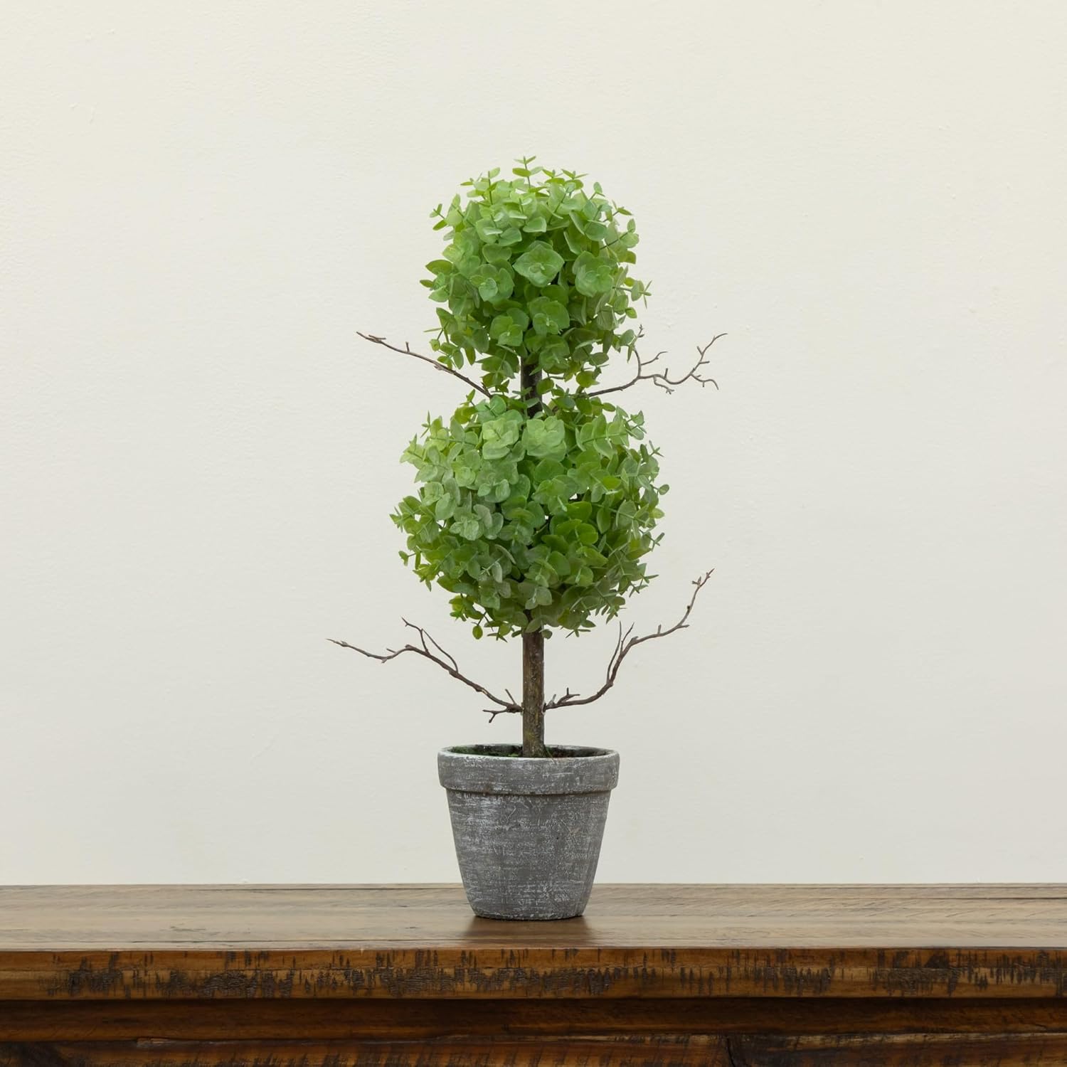 Bring a unique focal point into your space with this Eucalyptus Double Ball Topiary Artificial Tree. Two Eucalyptus balls are perfectly trimmed and groomed into a wonderful sphere shape that stem from a slender, brown trunk. Standing 2’ from a rustic planter curate in spaces that need some light and a rustic touch. Place it near a hanged mirror on a table to create a mesmerizing sight for your guests. Silk trees are manufactured using synthetic materials, such as polyester material or plastic, and are well designed and constructed to be life-like in appearance. This item will need to be re-shaped when removed from the secure box to allow it to reach its fullest size. Your artificial plant will look beautiful for years to come; simply wipe clean with a soft dry cloth when needed.