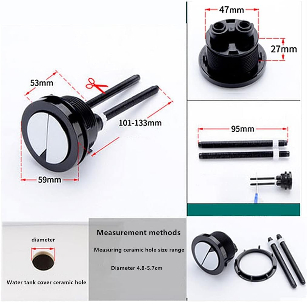 Made of ABS material, and practical to useEasy to use, Great for broken or old toilet seat .Fits most standard toilets with top fixings. control button design, strong practicality.It applies to the button hole having a diameter of 47mm water tank using.Name :Toilet Push ButtonsMaterial :ABS PlasticType : ButtonsUsage :toiletNote:Due to the light and screen setting difference, the item's color may be slightly different from the pictures.Please allow slight dimension difference due to different manual measurement.Quantity : 1 pcs