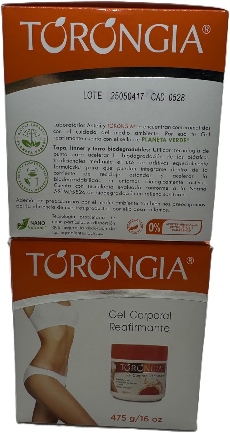 Pack of 2 pieces TORONGIA SLIMMING GEL Firming gel Cellulitis/GEL CORPORAL REAFIRMANTE 16oz. 475g each The firming body gel contains the association of various Origel natural ingredients (grapefruit essential oil, centella asiatica extract, among others) that provide an astringent and firming sensation, helping to modify and shape the appearance of the skin, obtaining a beautiful figure. with constant use. It is quickly absorbed, it is not greasy, it does not stain clothes, it is not sticky, it does not leave the skin stiff.