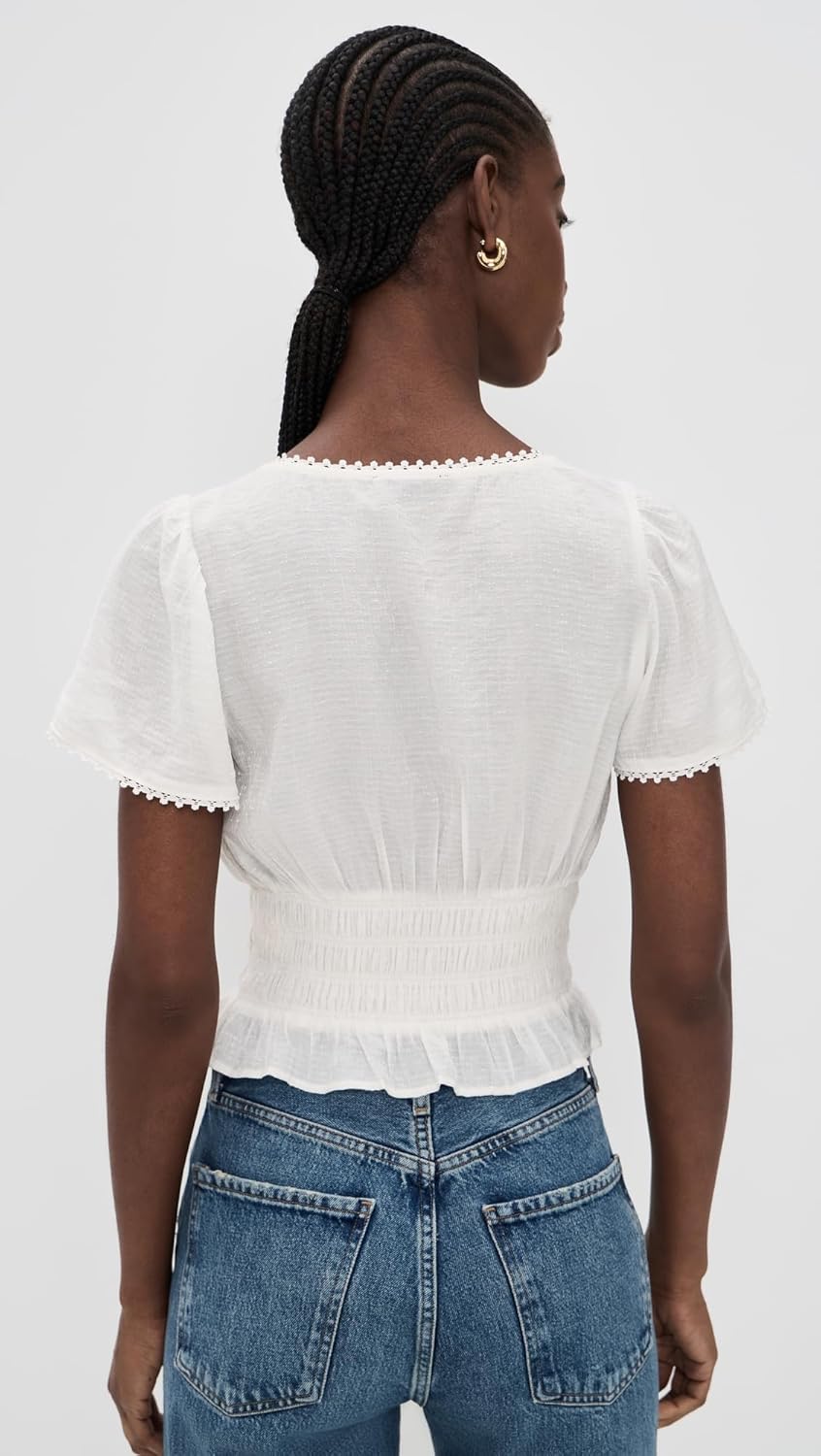 Crafted from a dotted rayon-nylon blend in crisp white, this short sleeve silhouette features delicate lace trim and a deep V-neckline for a feminine finish. Smocking at the waist creates a flattering, fitted shape, while the lightweight fabric adds soft texture and ease.