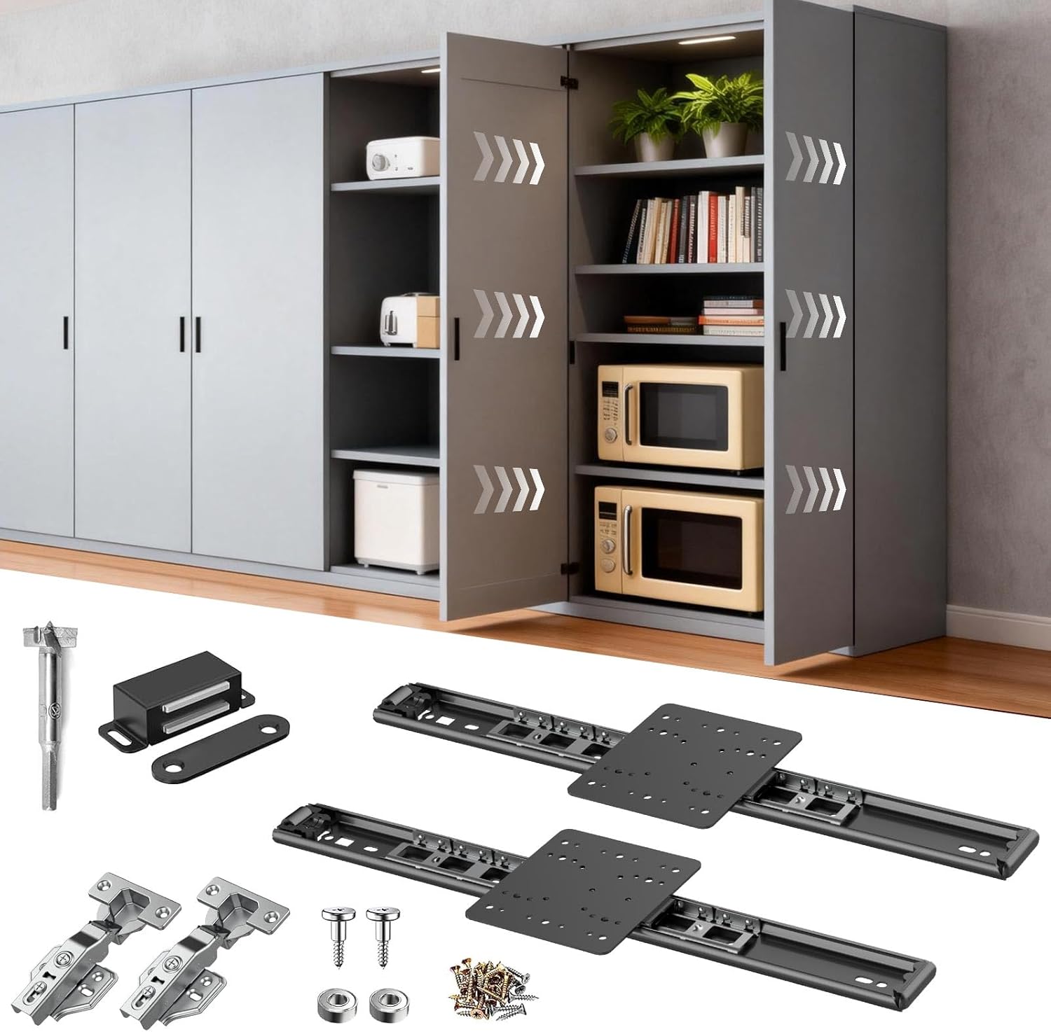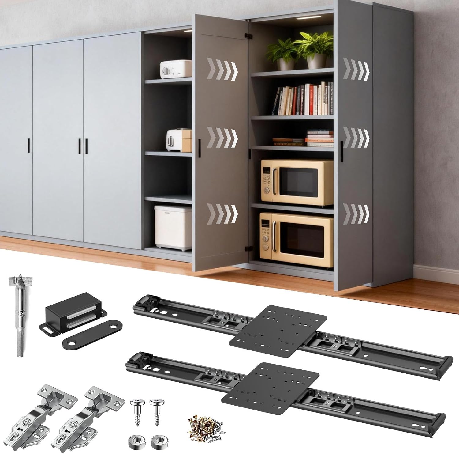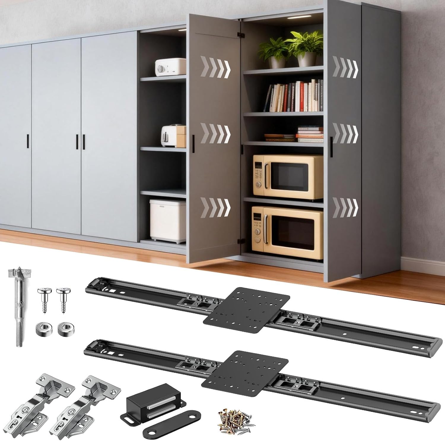 Crafted from high-strength steel alloy with precision ball bearings, this system ensures ultra-quiet, corrosion-resistant operation. The reinforced steel construction offers superior load capacity, while cushioned pads enable smooth, silent sliding for cabinet and inset doors.Its hidden track design maximizes space, allowing doors to seamlessly retract into walls—ideal for kitchens, closets, and tight areas. DIY-ready kits include slides, hinges, drill bits, and mounting hardware for tool-free installation. Available in 12"-24" sizes to fit various cabinet depths.Select models feature a sleek low-profile design with magnetic push-pull for effortless operation.